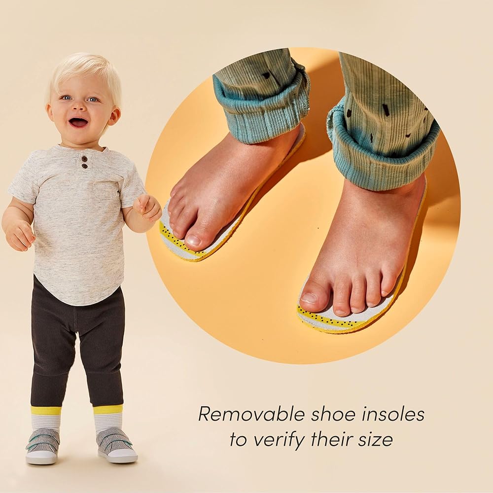 HEALTHY SHOES FOR KIDS - Approved by APMA (American Podiatric Medical Association) and developed with doctors, these shoes come with a wide, foot-shaped toe box with lots of breathing room (no squished toes!) for healthy development, and flexible, zero-drop soles for natural movement. EASY ON + SECURE FIT - Adjustable hook and loop straps & extra wide opening allow for easy on. Each pair includes removable character insoles to help kids learn left from right while also helping parents confirm size. BUILT FOR COMFORT & STABILITY - Ultra lightweight and flexible shoes made with soft & breathable cotton upper. High-traction, non-skid flexible rubber outsoles provide support, help prevent slips & develop balance. Durable toe caps protect little toes. SIMPLE IDENTIFICATION - Every sock is size-labeled (hand stitched inside the elastic) to prevent mismatched socks and make folding laundry a breeze. Our ankle socks are made longer than our crew socks as they may shrink more during washing. WOMEN FOUNDED & RUN - Ten Little is a mom-founded brand that makes the best high-quality, non-toxic products for kids at every size & stage to support healthy development & natural movement in growing kids