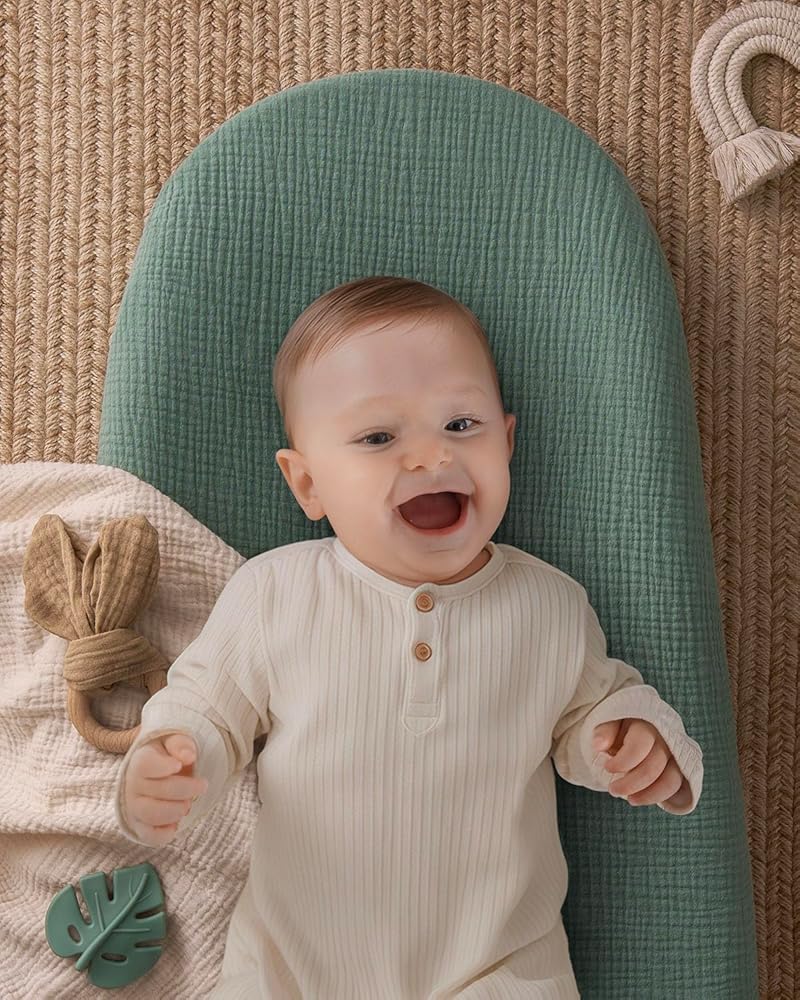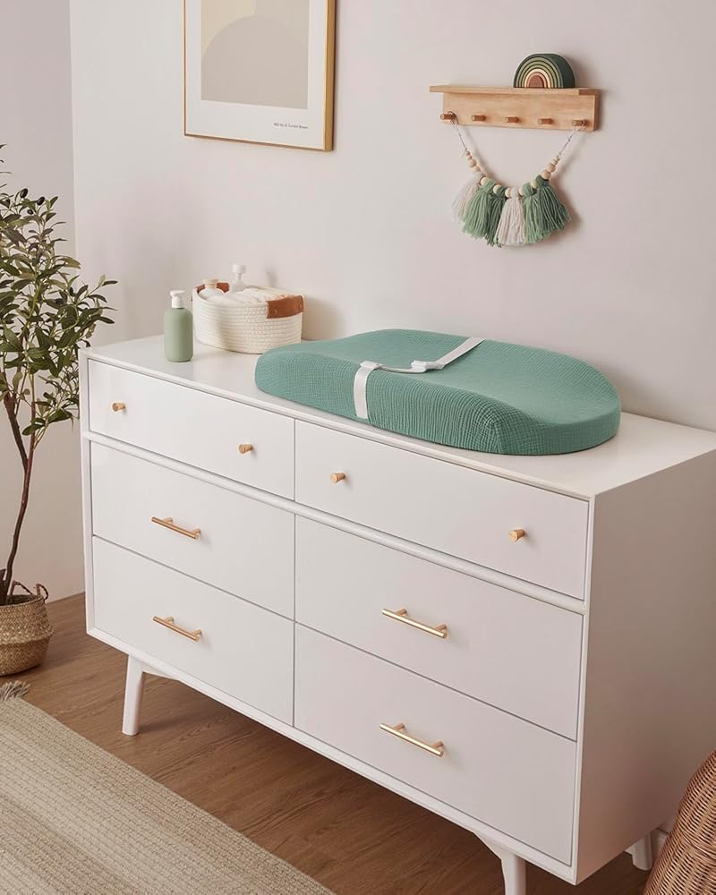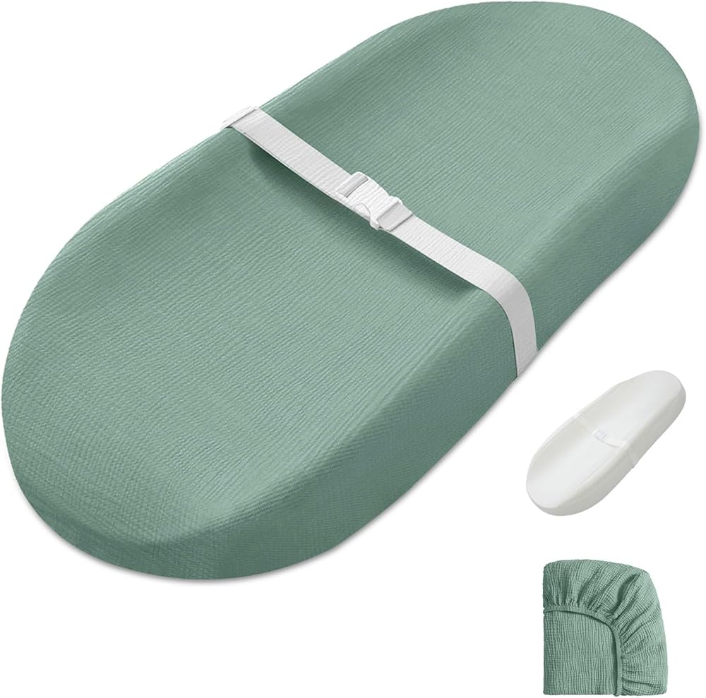 Made from soft, breathable muslin cotton, the Blissful Diary baby changing pad offers a gentle touch on your baby's delicate skin, while the cushioned foam provides even support, keeping them warm and comfy during diaper changes. The waterproof, wipe-clean foam pad surface makes cleaning a breeze, letting you relax and enjoy blissful bonding moments, whether it's a loving cuddle or a sweet kiss with your little one. The sheet-style cover, designed with an elastic band, effortlessly slips on and off for hassle-free washing. Roman Green adds a touch of elegance and serenity to your nursery, creating a soothing vibe that both you and your baby will love. All four safety features ensure your angel stays secure, including contoured anti-roll sides, a quick-release safety belt, adhesive straps, and a non-skid bottom. Whether you're designing your dream nursery or searching for the perfect unisex baby shower gift, this baby changing table pad combines comfort, style, and convenience, making it a must-have for modern parents.