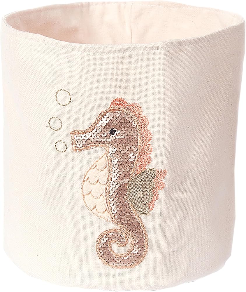 Mon Ami seahorse designer linen storage bins are lightweight and features sequins and glitter details. These versatile toy storage bins for kids are for storing and organizing various items in your children's play area, baby nursery, or bedroom, including stuffed animals, toys, filthy clothing, extra blankets, and pillows, among other things. Because of the adorable and alluring patterns that are featured on our baskets, your children will be inspired to place their soiled clothes or their toys inside of them.