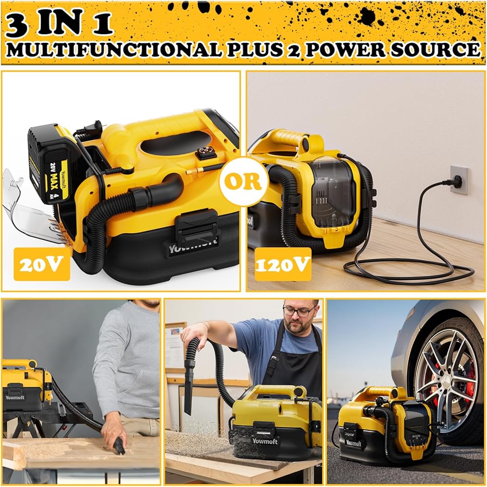 3 in 1 Shop Vac Cordless and Corded, Versatile Power Source with Tire Inflator and Blower Function, 2.5 Gallon Portable Shop Vacuum Wet and Dry for Dewalt 20V Battery, Small Shop Vac (with Battery)