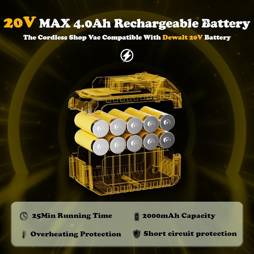 【Large Capacity Battery】 The package includes a 20V-4.0Ah-20000mah high-performance battery (this cordless shop vac also compatible with Dewalt 20V Max battery) allows the vacuum runs for up to 25+ minutes on a single charge, so you can complete larger cleaning tasks without interruption, enhancing efficiency. Oh yeah, there is also a corded option.