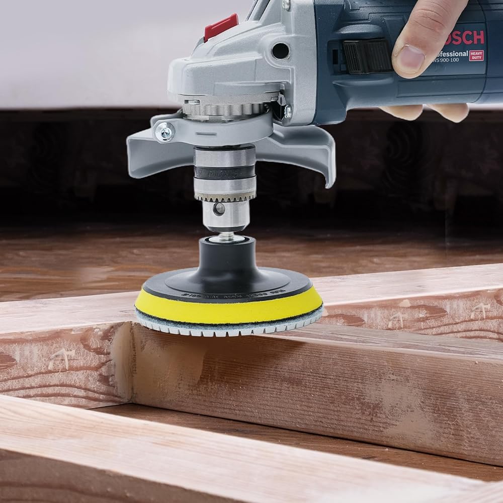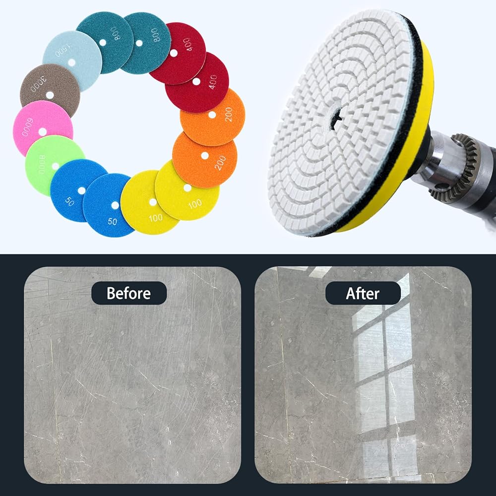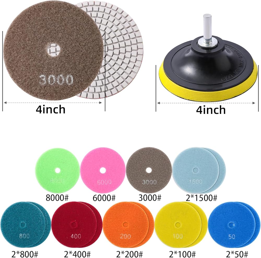 【UPGRDED & GREAT VALUE SET】14 pieces of 4-inch granite/marble polishing pads (2 Grit 50#, 2 Grit 100#, 2 Grit 200#, 2 Grit 400#, 2 Grit 800#, 2 Grit 1500#, 1 Grit 3000#, 1 Grit 6000#), Comes with 1 PCS upgraded velcro rubber backing pad (5/8 - 11 thread) and 1pc 8mm drill adapter, features greater flexibility, durability, absorption, will more effective at removing scratches and achieving a high-gloss finish