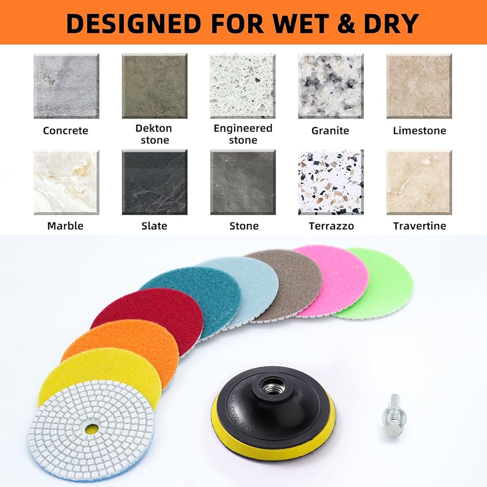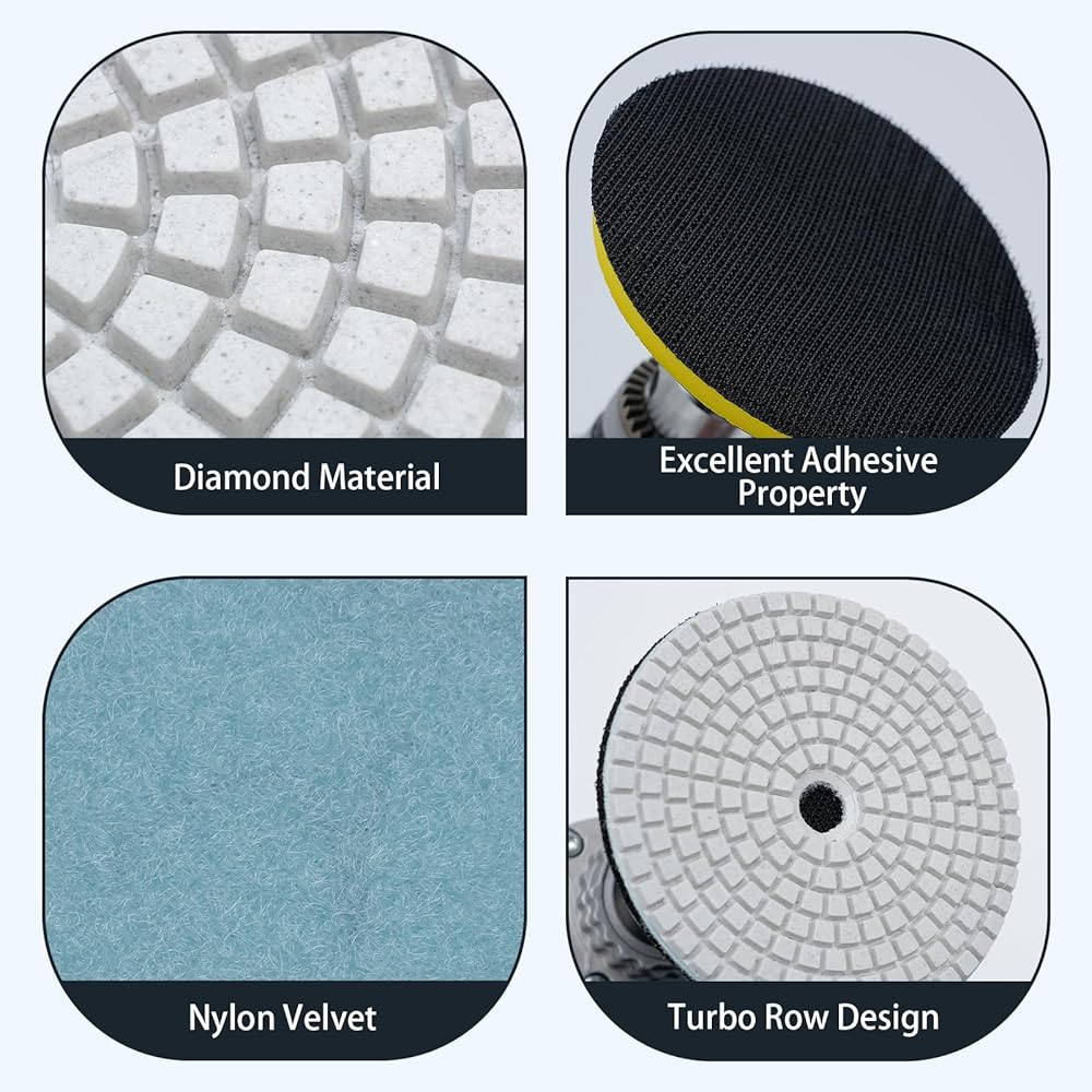 【PREMIUM QUALITY】These granite/marble/diamond polishing kit are made of high-quality diamond powder and resin powder, aggressive and durable. Hook and loop backing pad is made with premium-grade rubber, semi-flexible backer. The flexible design can adjust to different shapes of surface like corner or edge or curve surface