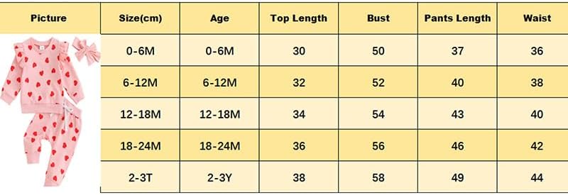 3-6M Tops Length: 12.6 Bust: 20.47 Sleeve: 9.84 Shoulder: 9.06 Pants Length: 14.96 Waist: 14.96 Advised Age: 3-6 Months