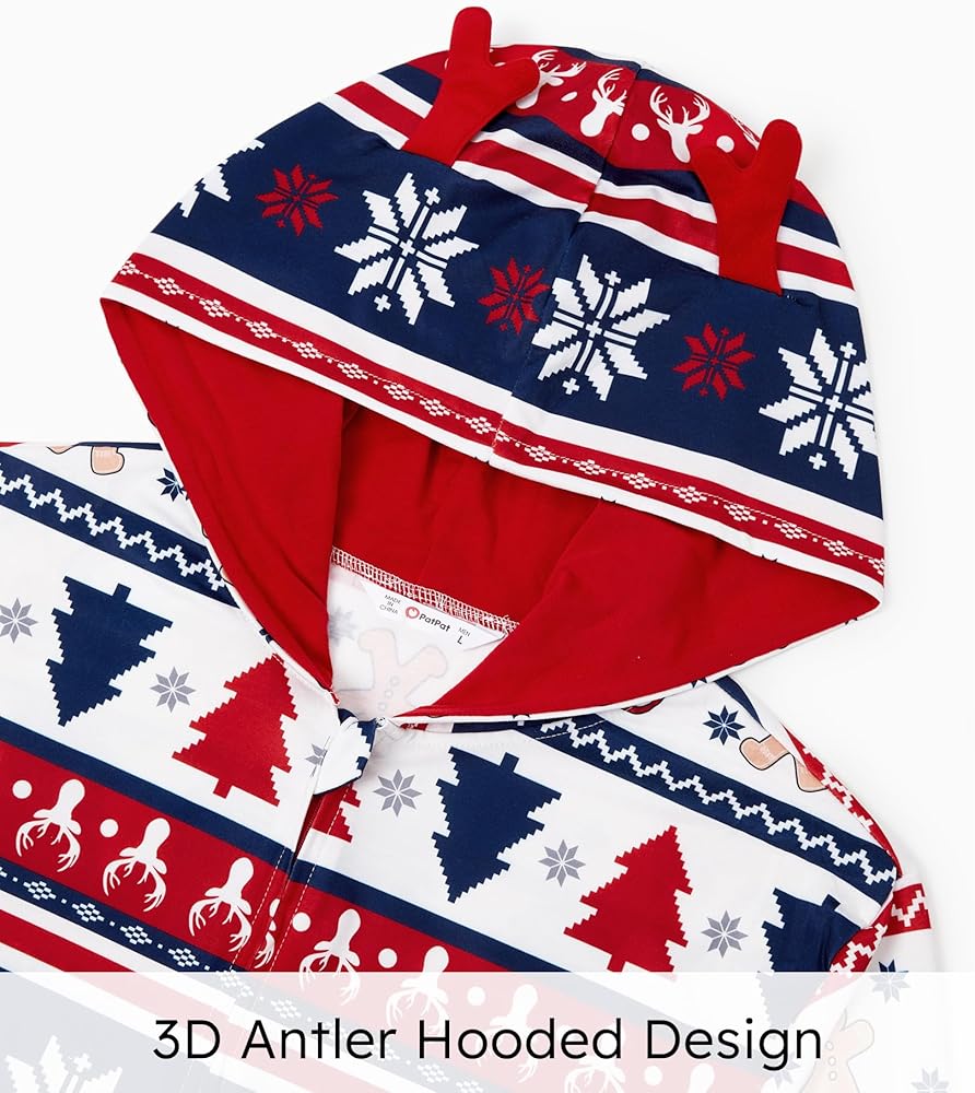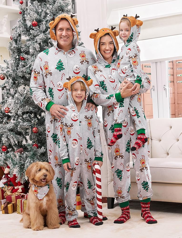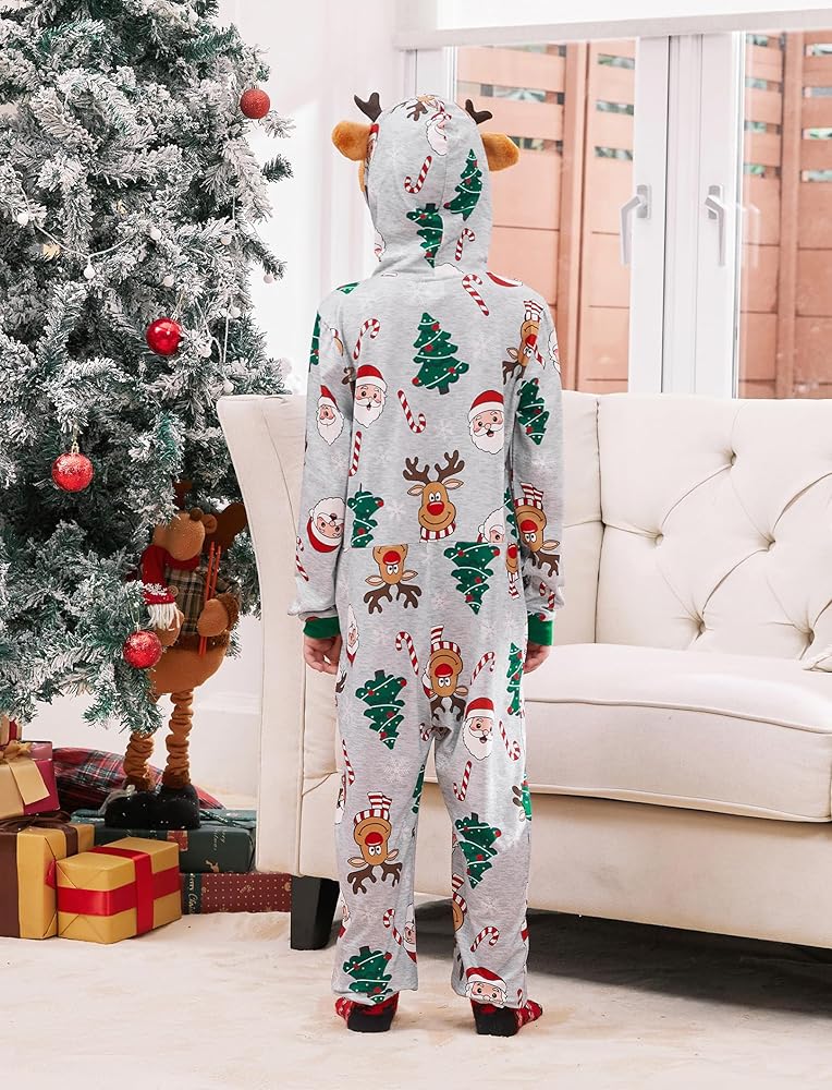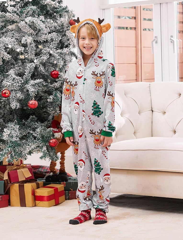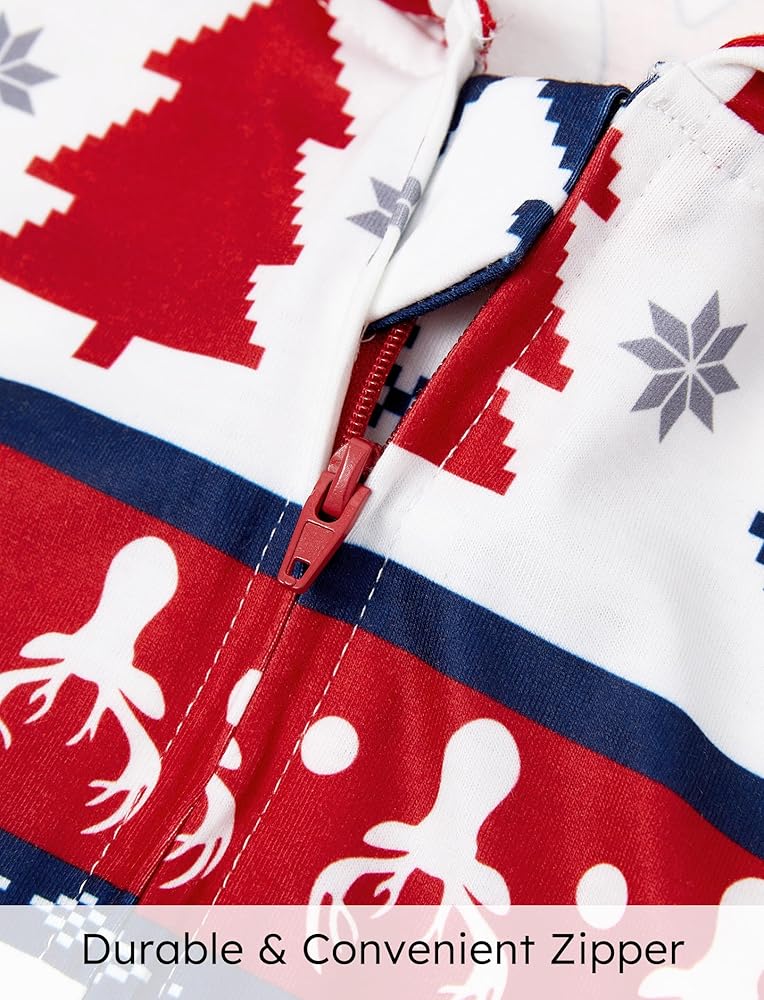 Family Pajamas Matching Sets: hooded, one piece romper, zipper closure, deer printing, long sleeve, hooded pajama suit, make these pajamas perfect for Christmas festivities.