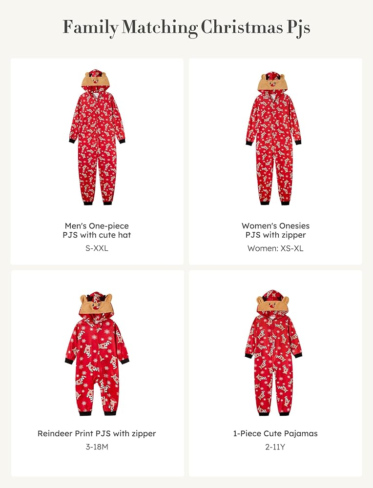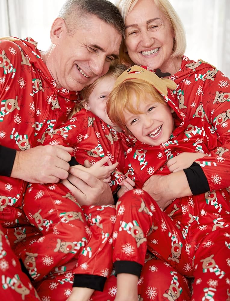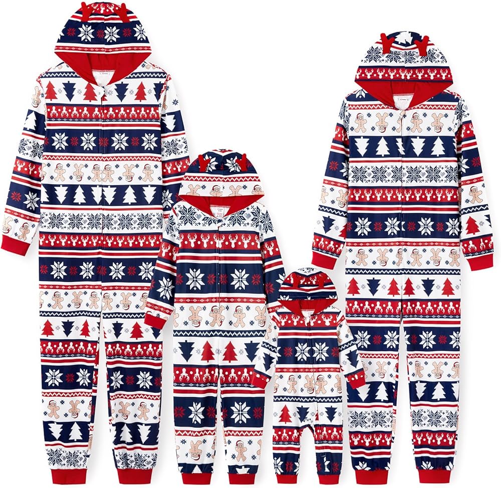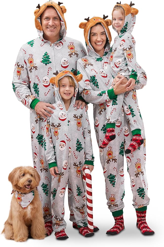 Family Pajamas Matching Sets: hooded, one piece romper, zipper closure, deer printing, long sleeve, hooded pajama suit, make these pajamas perfect for Christmas festivities.