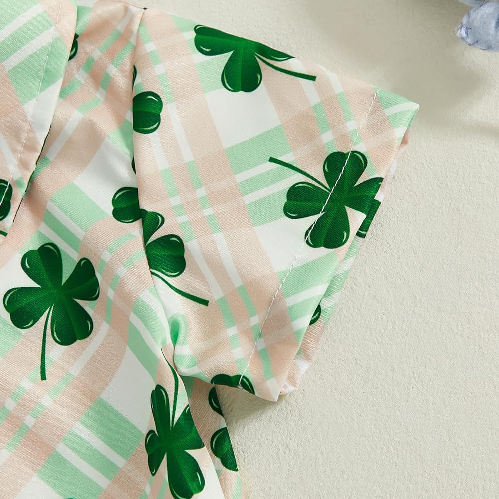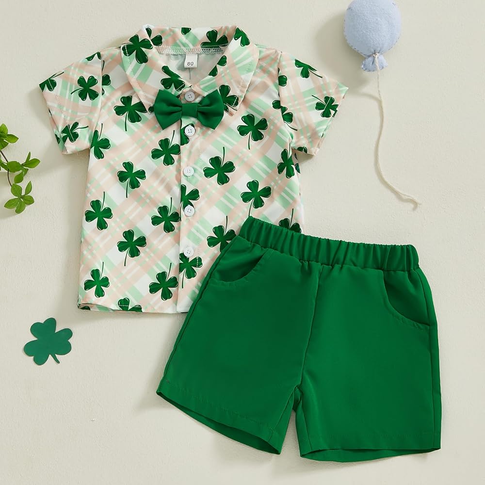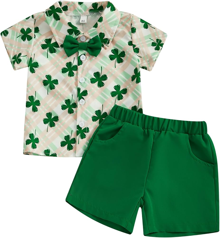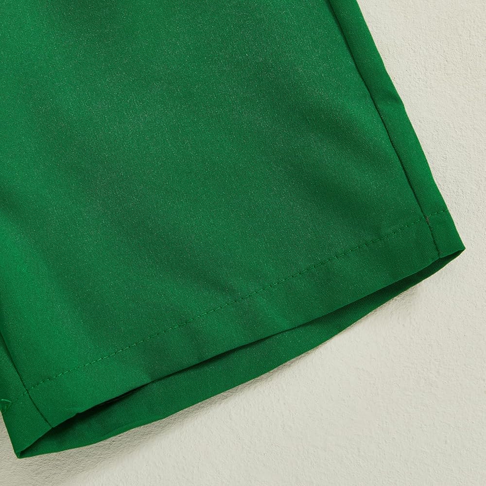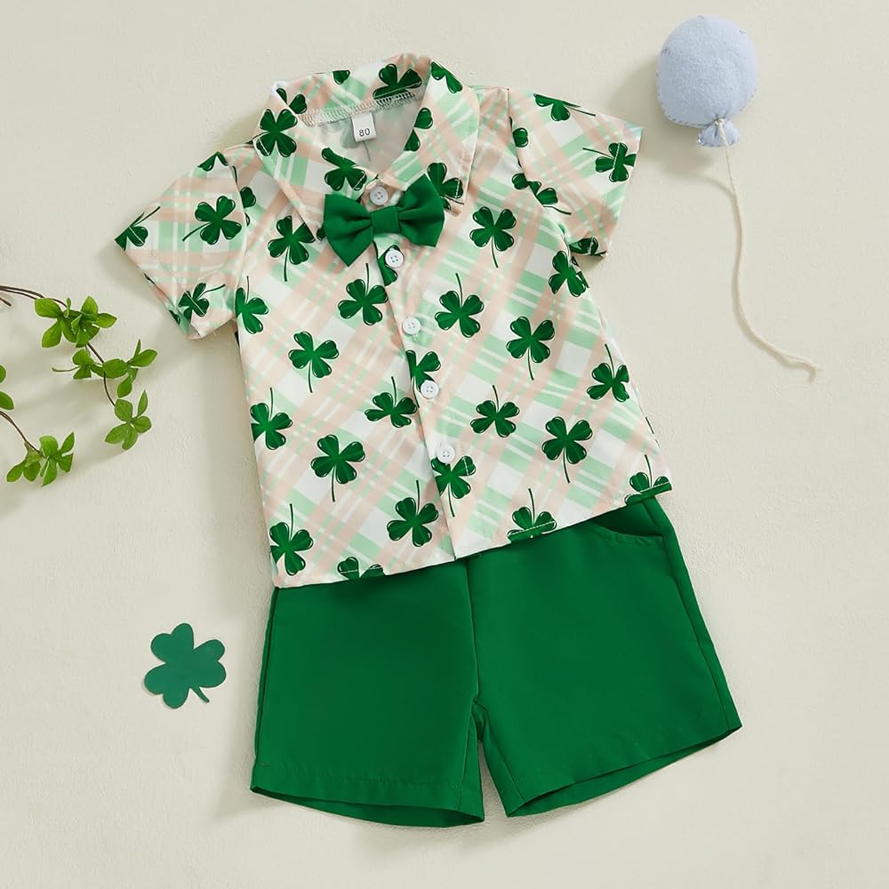 Toddler Boy Short Sets Clover Print Short Sleeve Button-up Shirts Solid Shorts 2 Pcs Irish Outfit