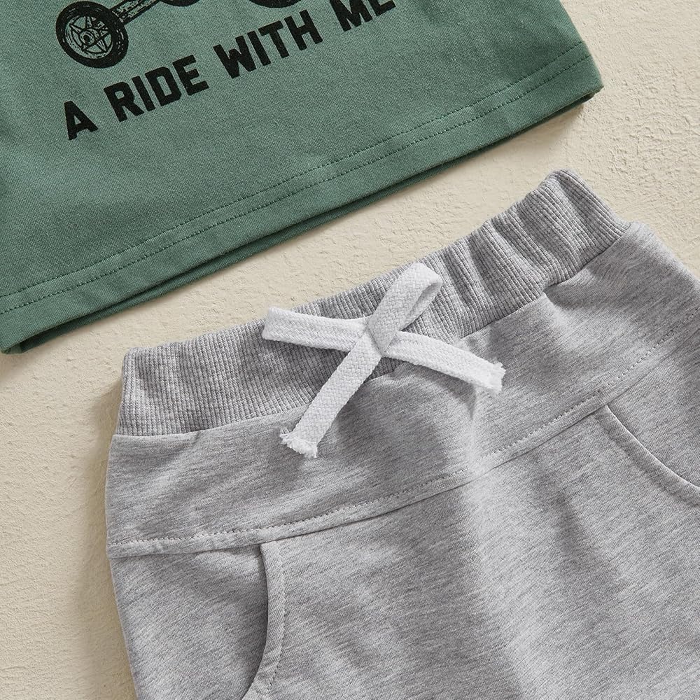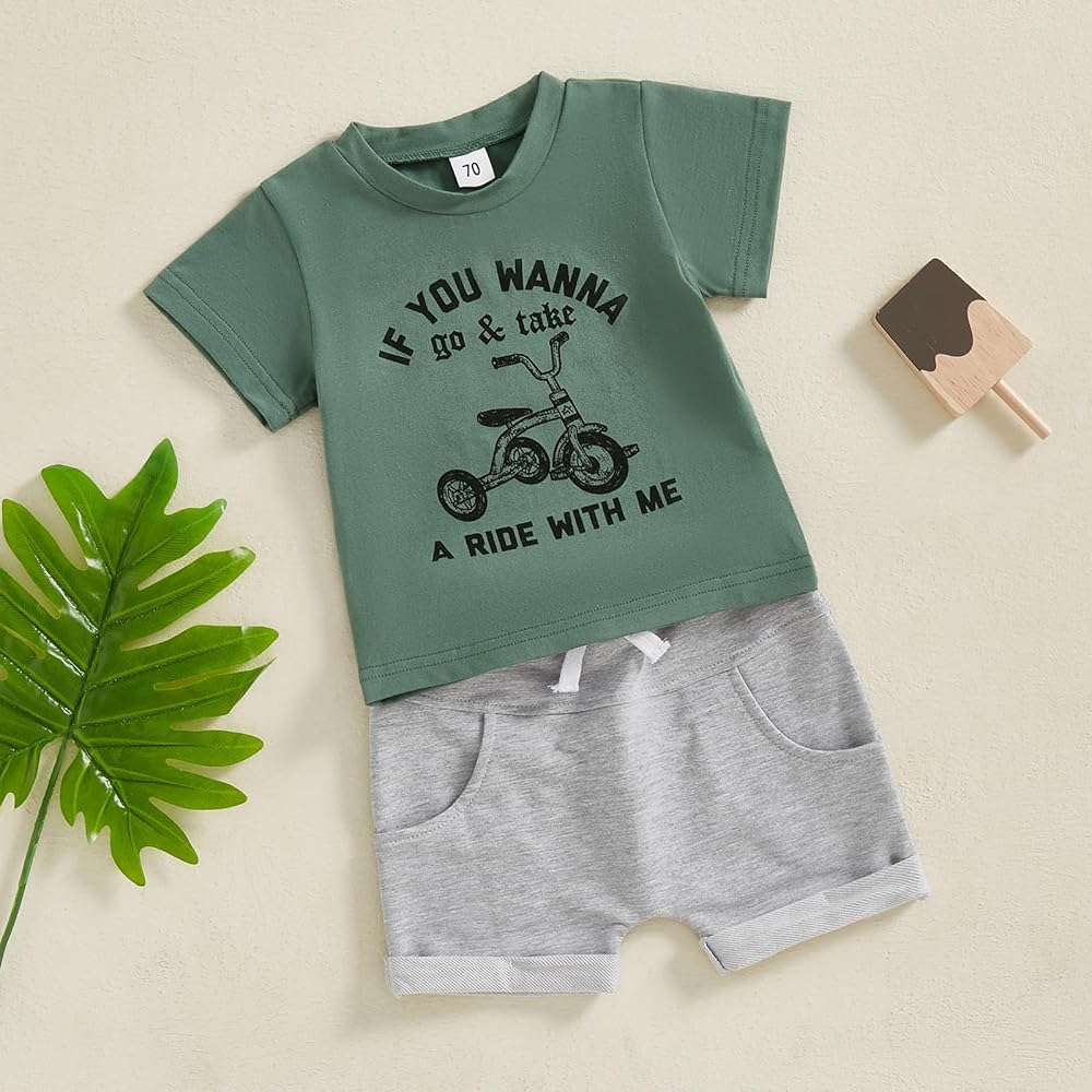 Features: Baby boy summer clothes, cute baby boy clothes, short sleeve t shirt, tricycle and letters "IF YOU WANNA GO TAKE A RIDE WITH ME" printed tops, solid color shorts, simple and classic style, brother matching outfits, baby boy summer outfits, toddler clothes for boys, baby clothes boy, infant clothes boys. Cute baby toddler boy 2 piece shorts set.