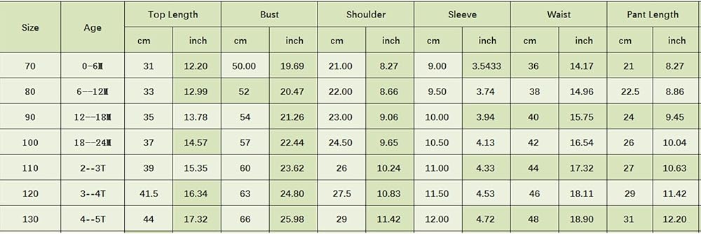 90 Tops Length: 13.78 Bust: 21.26 Sleeve: 3.54 Shoulder: 9.06 Waist: 15.75 Shorts Length: 9.45 Suggest Age: 12-18 Months