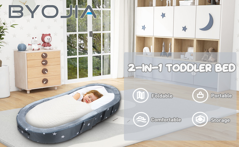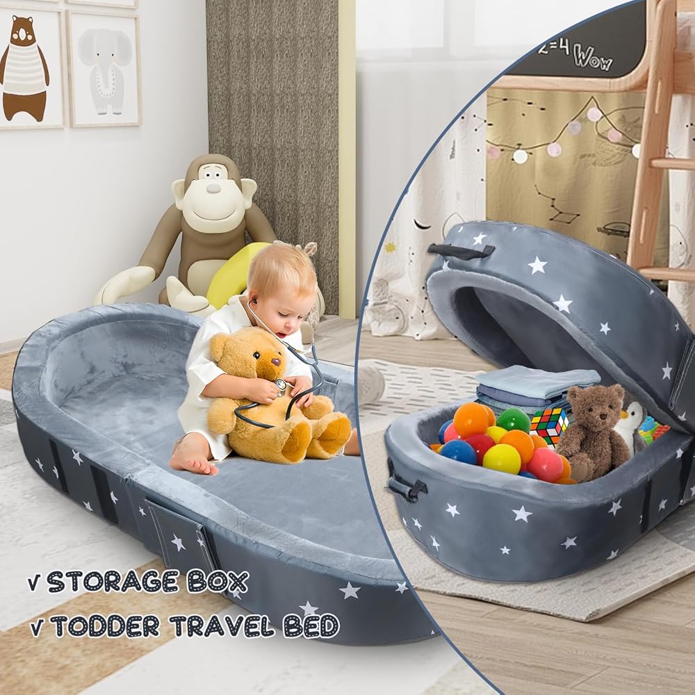 2-in-1 Toddler Bed: The versatile 2-in-1 portable toddler bed caters to both your child's comfort and your practical needs. It seamlessly transitions from a cozy crib, offering a soft and secure resting space for naptime, to a spacious storage box perfect for stowing away toys, clothes, or other essential items when folded.