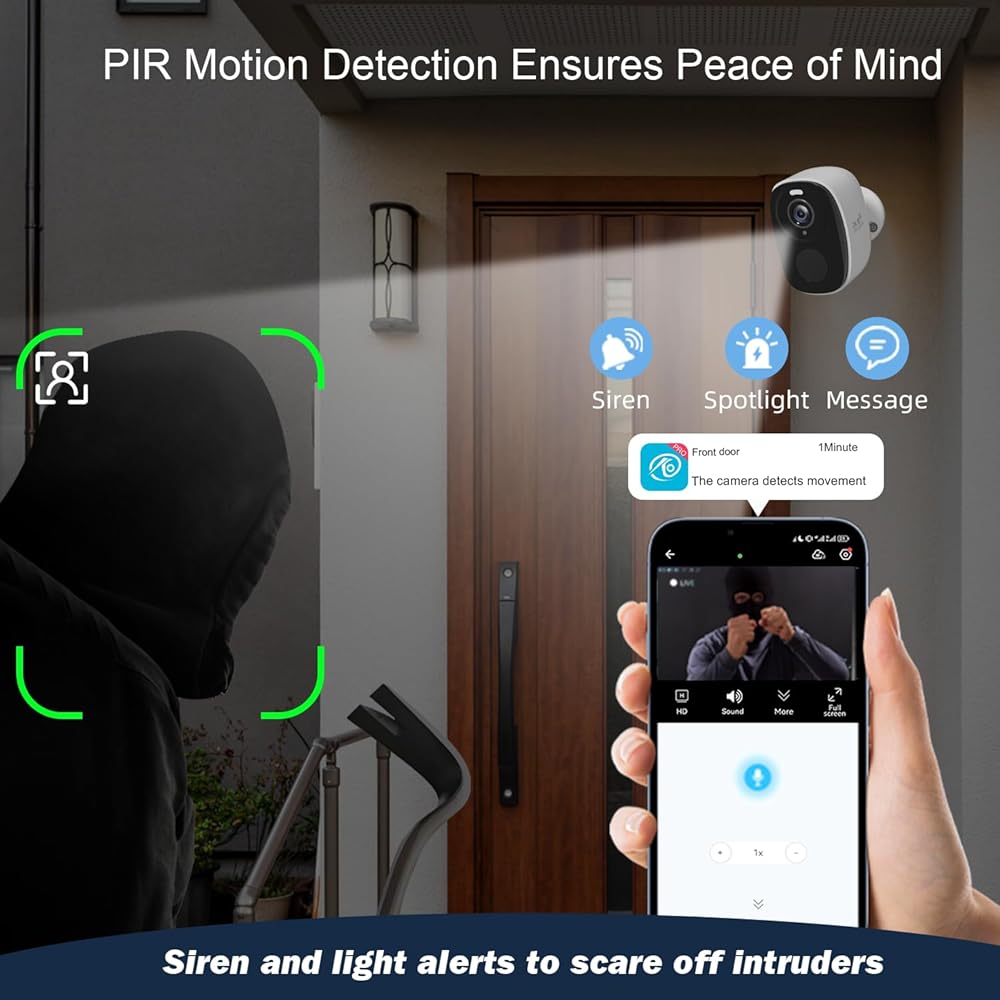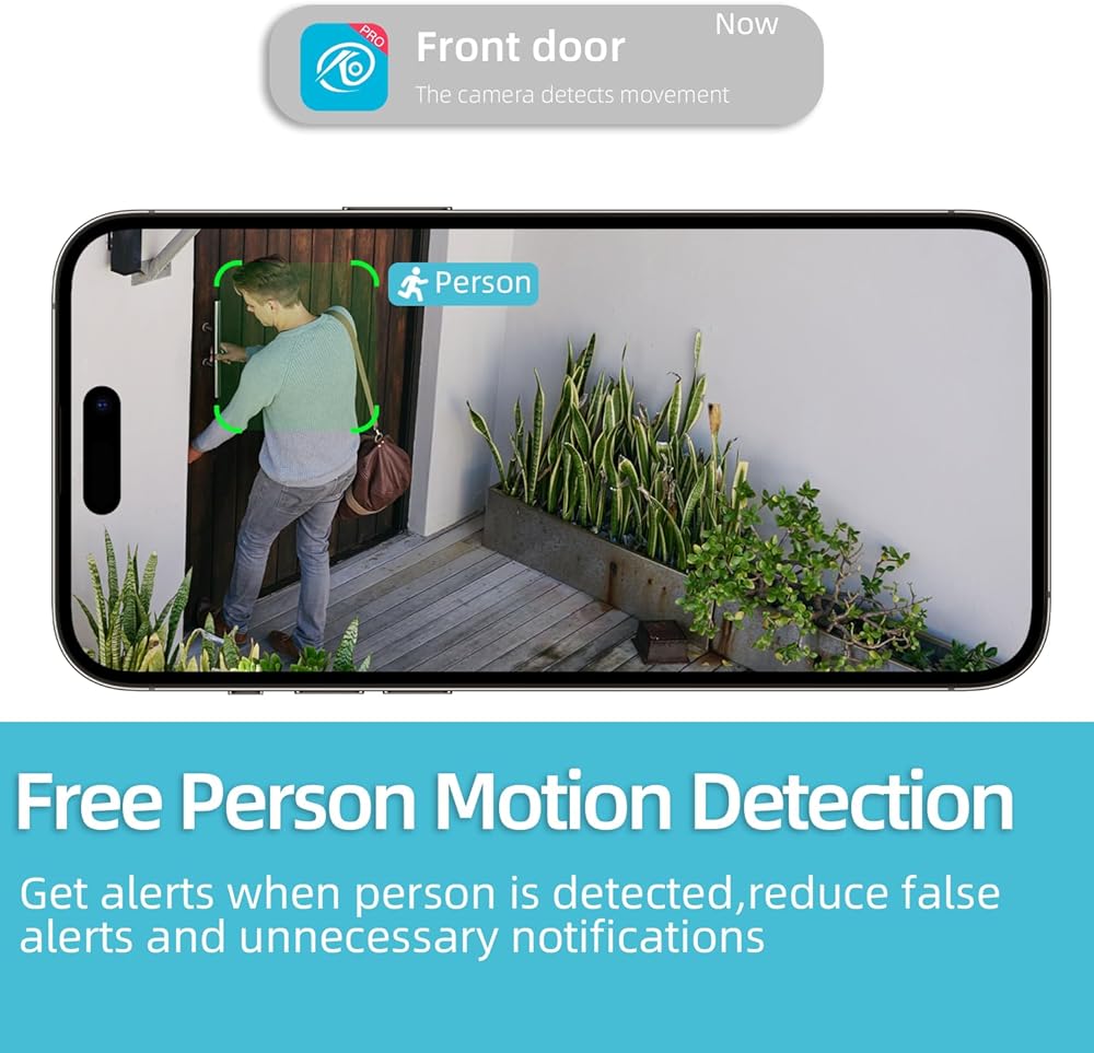 【Smart PIR Motion Detection & AI Alerts】With advanced PIR and AI motion detection, the camera can differentiate between people, animals, and other objects, reducing false alarms and sending real-time notifications only when necessary. This makes it a great fit for a subscription-free wireless home security camera system outdoor.