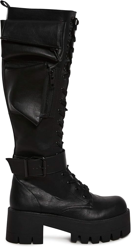 Once ya do a double-cross, ya gotta be ready to fight in the Obsidian Pocket Combat Boots by Dolls Kill! These knee-high combat boots feature a sleek black vegan leather construction, ultra-high wedge heels with a 2.5" heel, and a 1.5" platform for added height. With zippered side pockets, full-length laces, matte black hardware, adjustable buckle straps, and side zip closures, these boots bring an edgy, powerful look to any outfit.