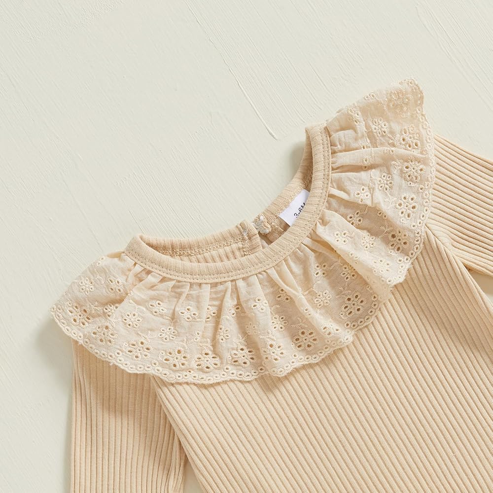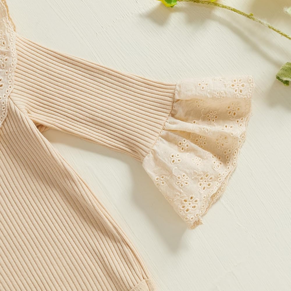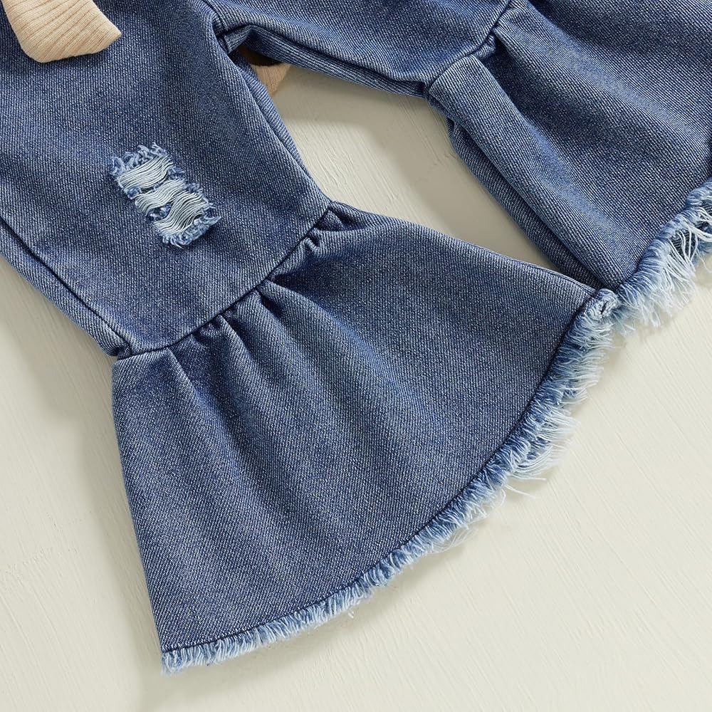 Baby Girls 2 Piece Outfits Ruffle Long Sleeves Romper and Ripped Denim Flare Pants Toddler Fall Clothes