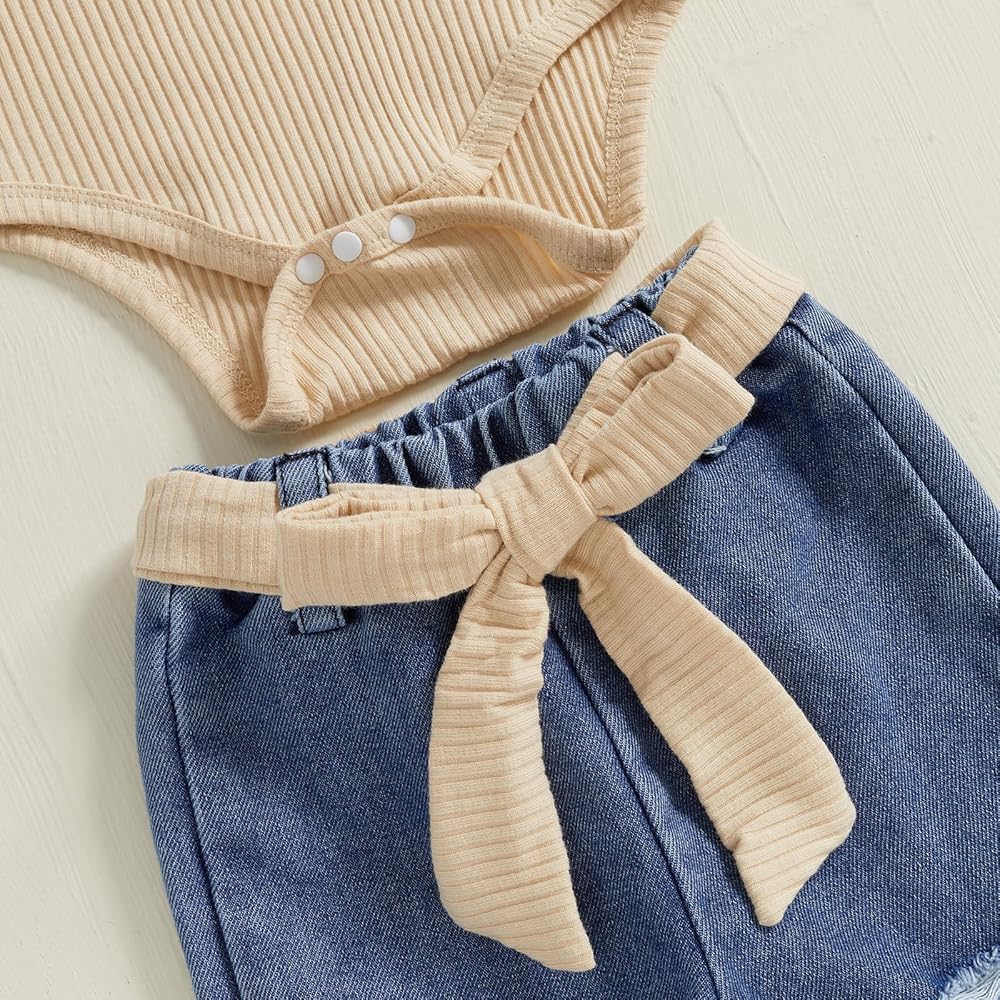 Baby girl romper with ruffles and long sleeves, round neckline design; Baby girl denim flared pants with belt, ripped, elastic waist ensures a comfortable fit; Spring dresses for girls make your baby even more adorable