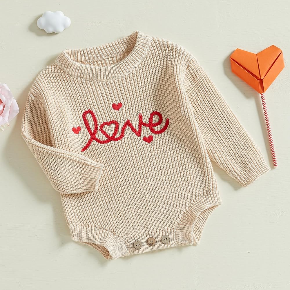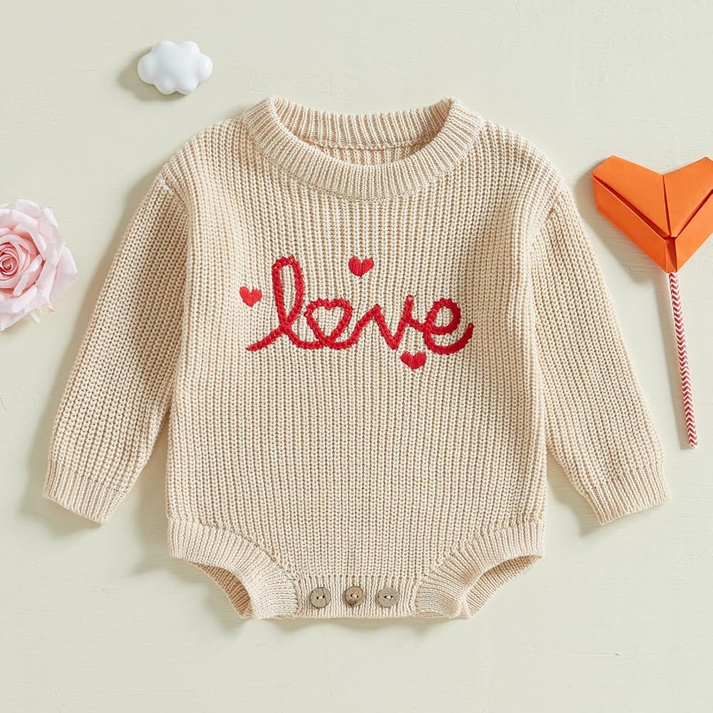 Feature: Valentines day baby girl clothes, valentines day baby boy clothes, newborn valentines sweater romper, baby valentines knit sweater romper, baby boy valentines knit bubble romper, oversized sweater romper, long sleeve, crew neck, heart & letter embroidery, infant bodysuit, button closure at the bottom, easy to change diapers, newborn valentines knitted romper, sweet and fashionable; Your little princess will look more adorable and eye-catching in this one piece romper