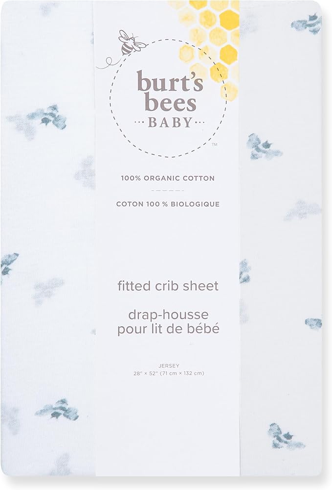 Embrace the comfort of the Burt's Bees Baby Fitted Crib Sheet, a nursery and baby registry gift essential. Crafted with care from 100% organic GOTS-certified* cotton, this sheet is a sanctuary of comfort for your baby's delicate skin. Combed and ring-sun, these sheets are super soft, durable, and breathable, promoting restful sleep for your baby. Our BeeSnug 360 design ensures a snug fit for standard cribs and toddler mattresses, making it a versatile choice for any nursery. These easy-care, machine-washable sheets get softer with every wash while the patterns remain vibrant. Available in a variety of adorable hand painted watercolor prints suitable for baby boys and baby girls, our sheets not only complement your nursery décor but also serve as a cherished essential for any parent. From floral patterns to animal and geometric patterns, you can mix and match to find the perfect crib sheet to match your nursery theme. Our classic jersey knit fabric gives your little bee the same feeling you get when you slip into your favorite t-shirt. It is warmer to the touch than woven sheets, providing a smoother transition from snuggling in your arms to safely sleeping in their crib. *GOTS Certified by CU 831717