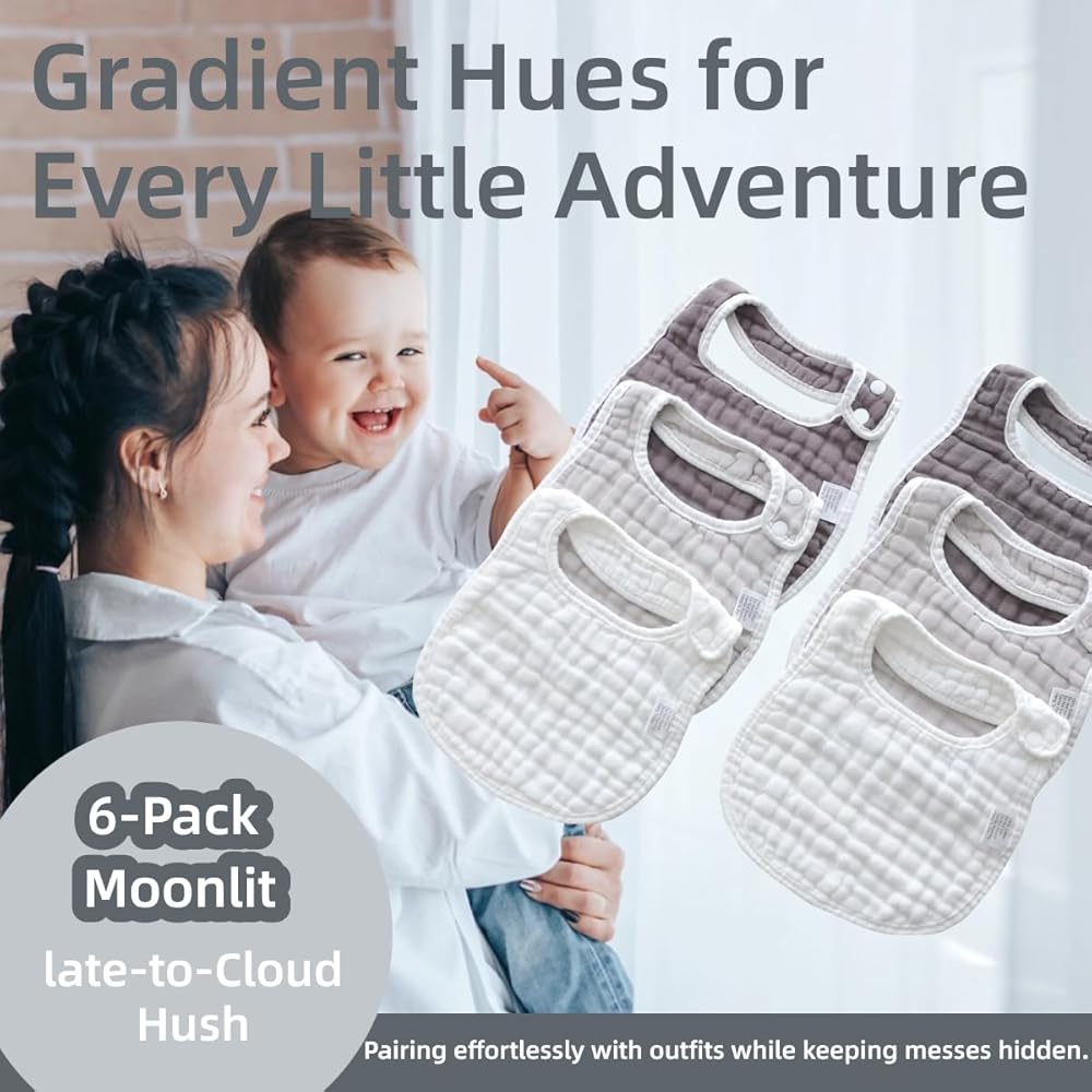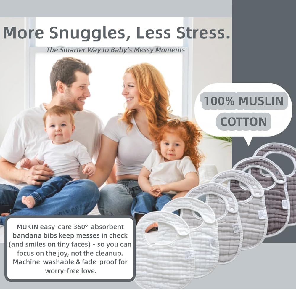 MUKIN Baby Muslin bibs and Burp Cloths offer a soft and absorbent solution for your little one's drooling, teething, and feeding needs. Crafted from high-quality cotton, these bibs are gentle on delicate skin while effectively catching spills and messes. The adjustable snap closures ensure a comfortable, secure fit, making them perfect for active babies. With a pack of six, you'll always have a clean bib on hand. Measuring approximately 9 x 14 inches, these generously sized bibs provide ample coverage during mealtimes or teething sessions. The lightweight muslin fabric is breathable and easy to care for, making these bibs a practical and convenient choice for parents on the go.