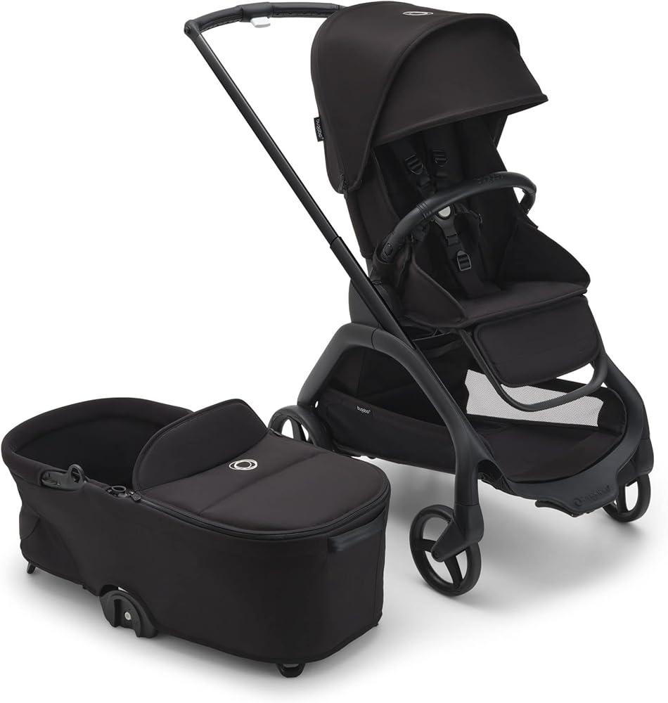 Experience the future of urban strolling with the Bugaboo Dragonfly city stroller, designed for modern families and bustling city life. The Bugaboo Dragonfly's innovative, one-hand stand-up fold design lets you fold the stroller into a compact self-standing position without removing the seat or bassinet. Then, easily store it in a closet, car trunk, or narrow hallway. This lightweight urban stroller is always ready to go, whether in bassinet or seat configuration. Its City driving experience allows you to navigate busy streets, stairs, crowded stores, and parks: a longer handlebar and sturdy chassis provide responsive steering; smart full suspension ensures excellent shock absorption; plus enhanced urban wheels allow for sharp handling on any city terrain. And the integrated carry strap enables you to transport the stroller hands-free for baby-holding. The baby stroller prioritizes your toddler's comfort with a lie-flat seat and adjustable leg rest. The full-size bassinet with breezy panel cradles newborns, while the extendable UPF 50 sun canopy protects them from the elements. As your child grows, the easy-buckle padded harness ensures a secure and comfy fit.