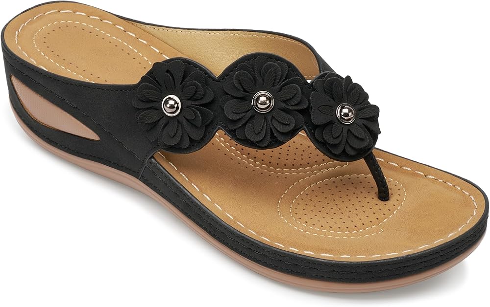 Upgraded PU Leather: Womens sandals have soft vegan leather strap, with exquisite flower decoration, fashionable and simple. The moisture-wicking footbed makes it the ideal summer essentials wedge sandals for women