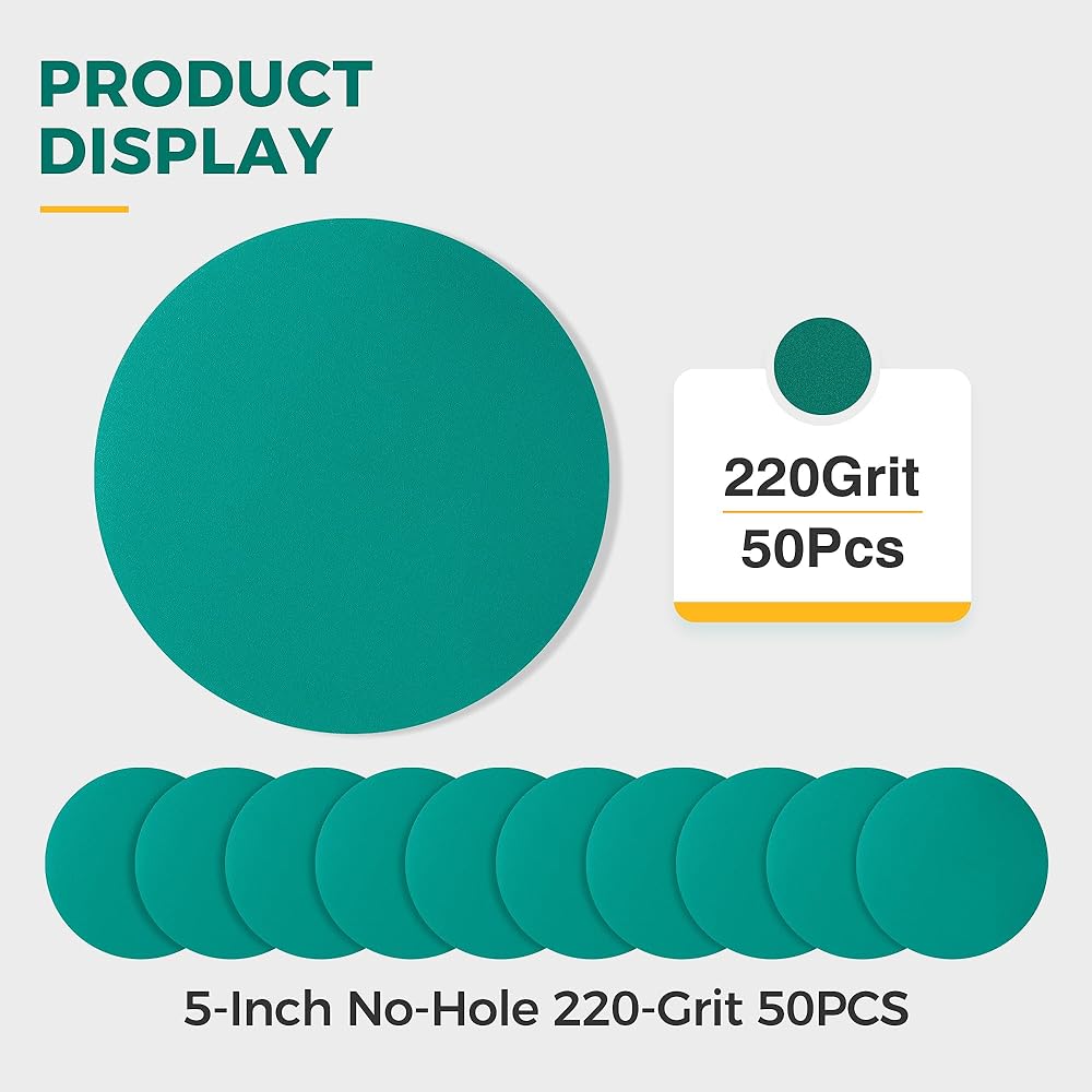 5-inch no hole Assortment - 80, 120, 150, 180, 220 Grit (10 of Each) grit green sandpaper sheet is a professional-grade sanding tool designed to provide an efficient and precise solution to your sanding and polishing tasks. Whether you're targeting wood, metal, or other surfaces, these sandpaper sheets quickly remove unevenness, oxides, and imperfections to create an outstandingly fine finish.