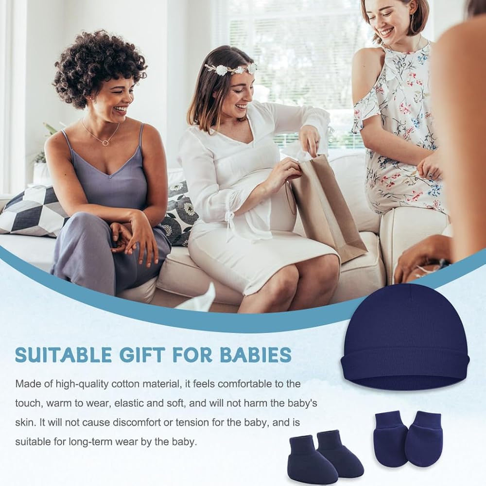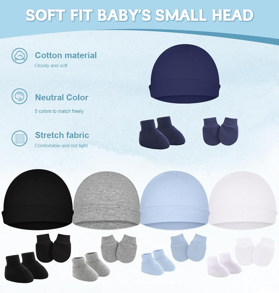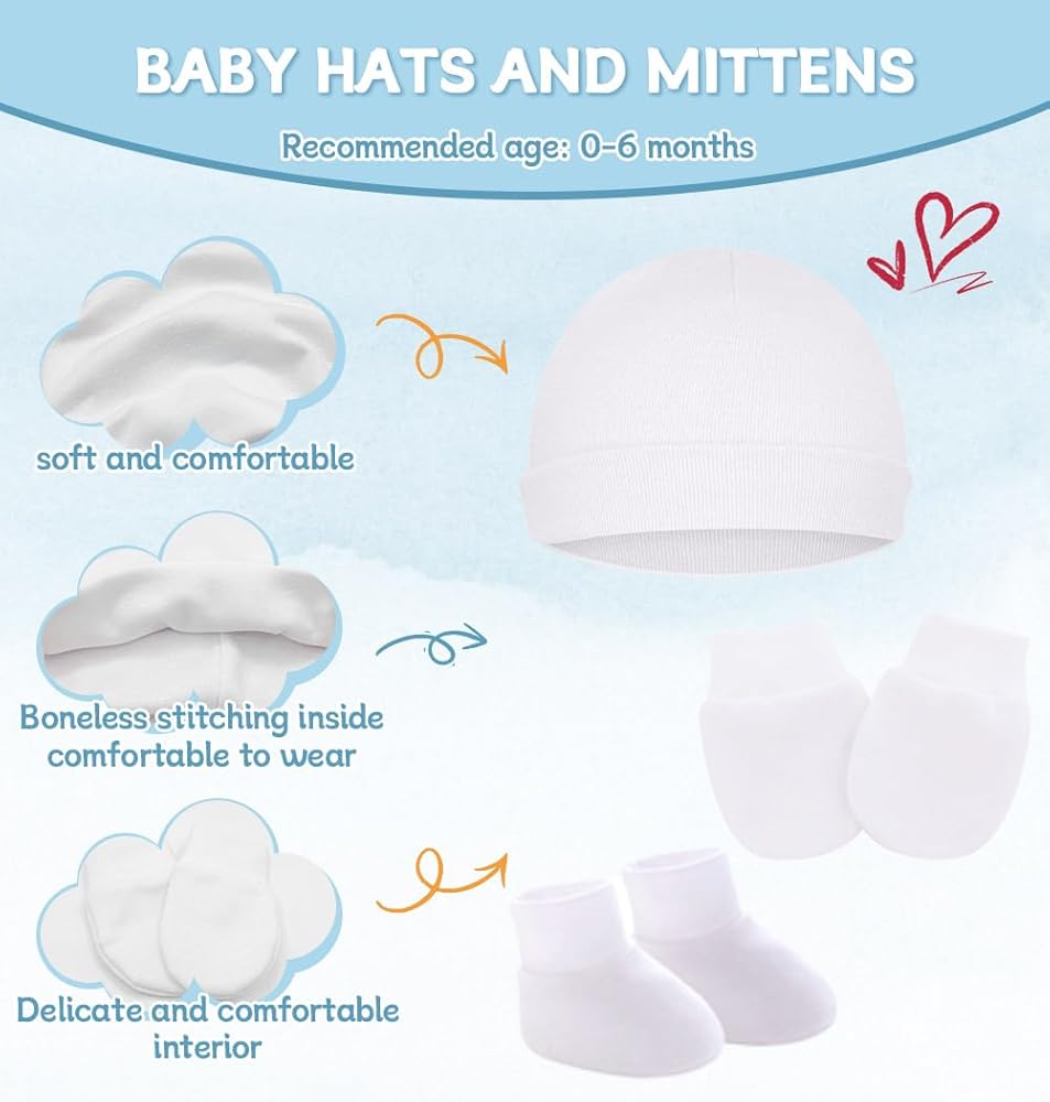 【NEWBORN ESSENTIALS MUST HAVES SETS】- Each baby socks mitt and hat set is stretchy for a better fit against your baby's skin. The elastic gloves are fixed on the baby's little hands, which can effectively prevent the baby from scratching himself.