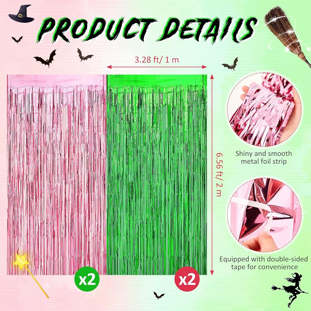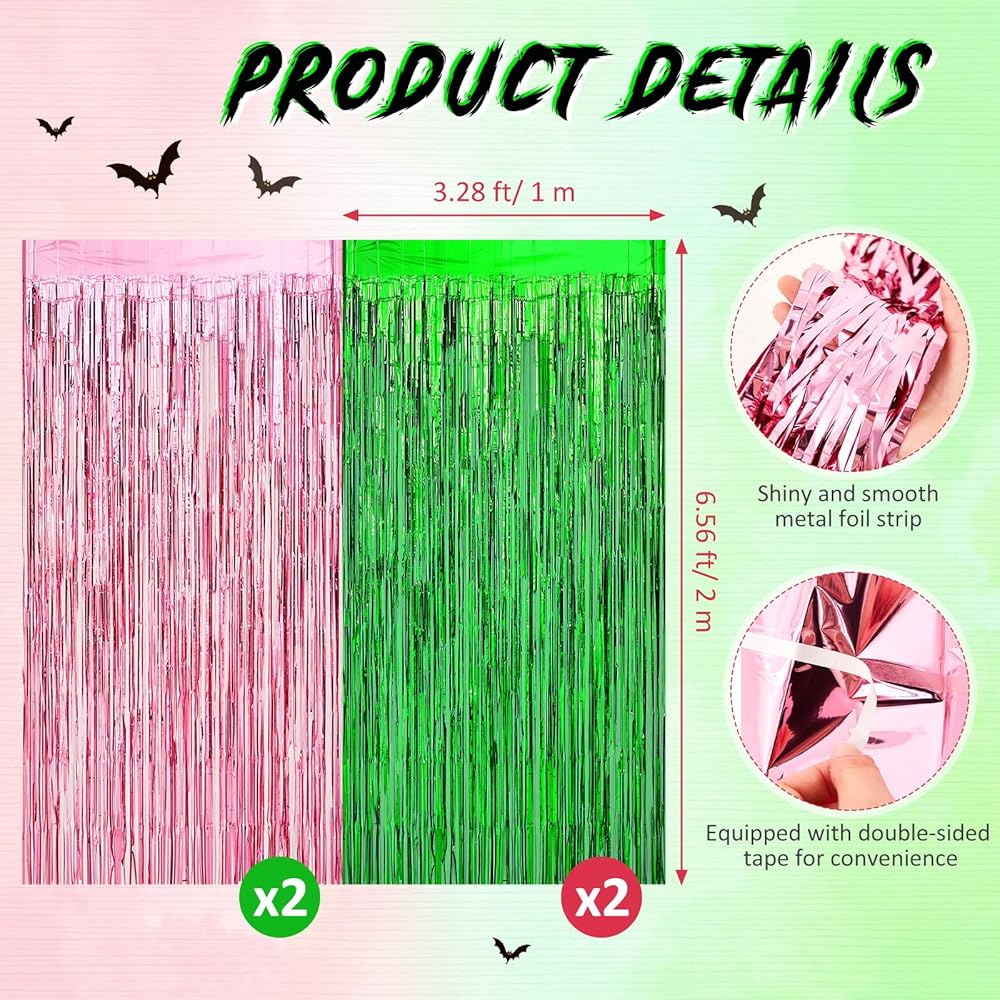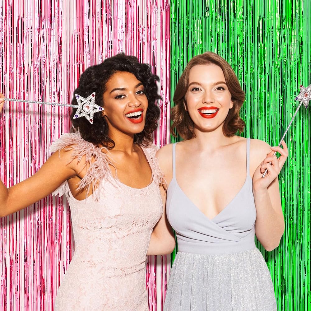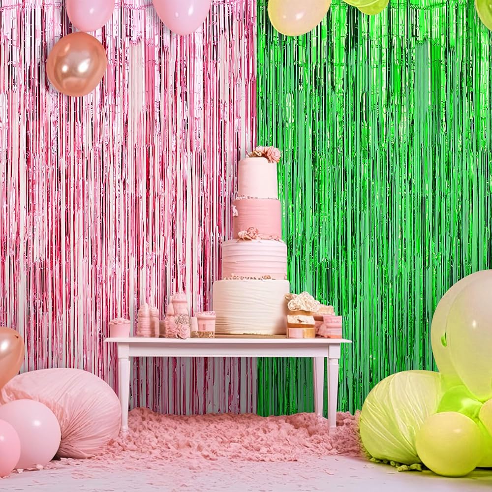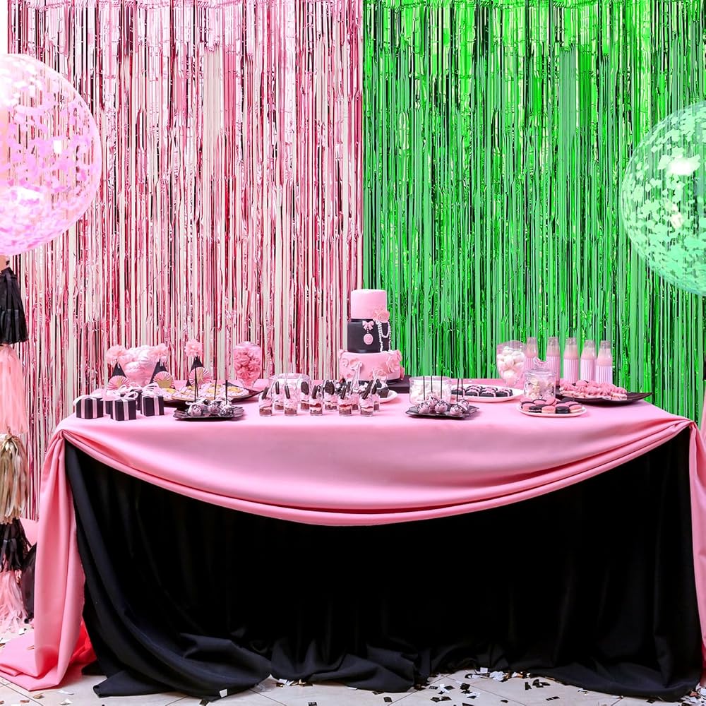 The package includes 4 green pink foil fringe curtains. With its large size of 3.28 x 6.56 ft/ 1 x 2 m, it offers great value for your money. It can cover large surface areas, making it an economical choice for a striking, metallic photo booth streamer backdrop.