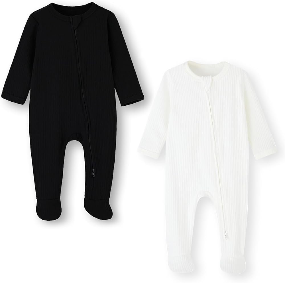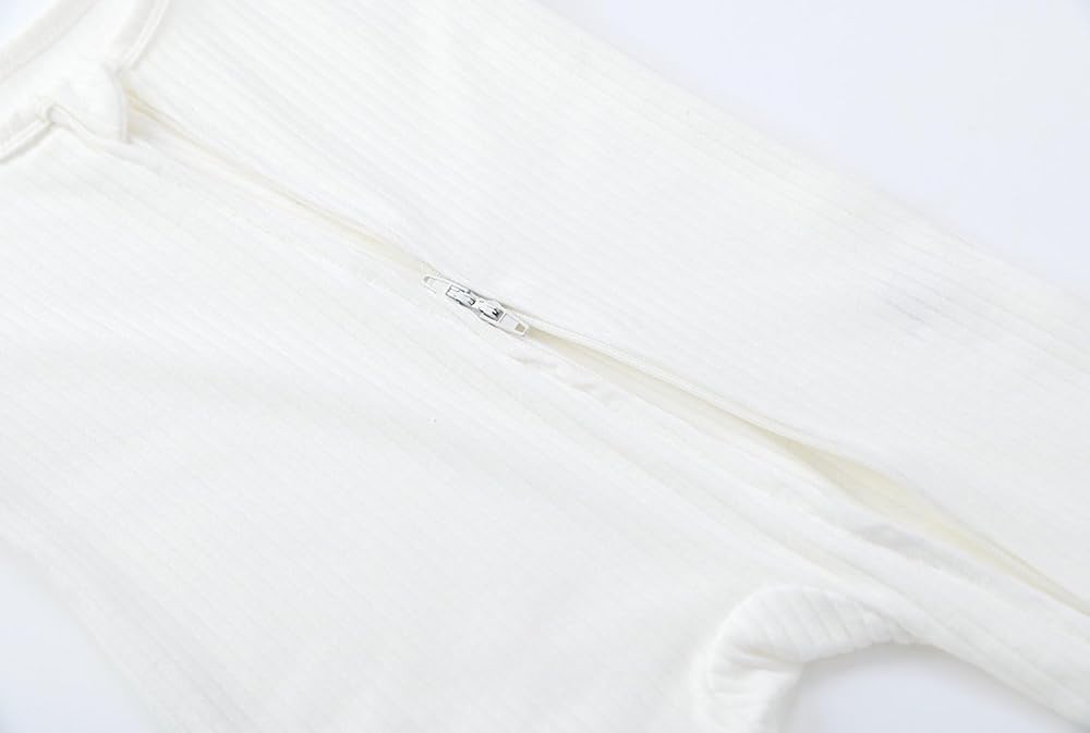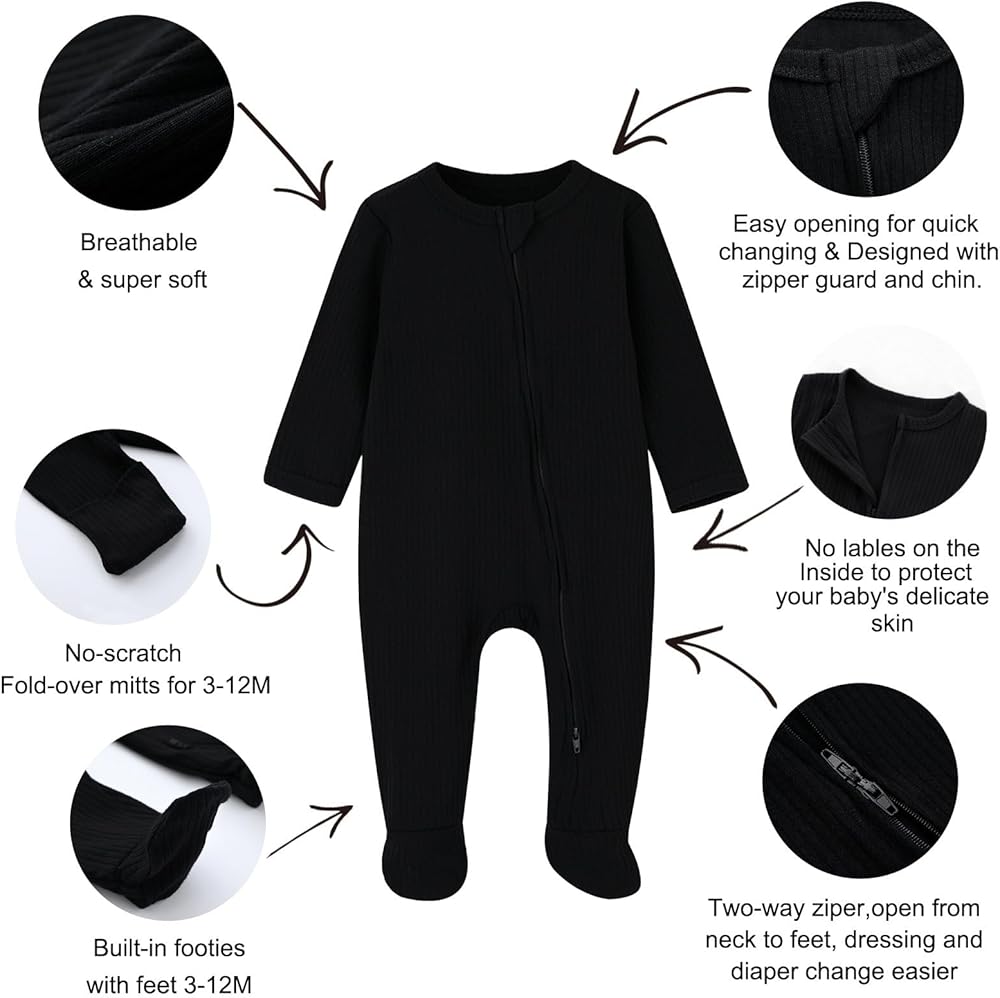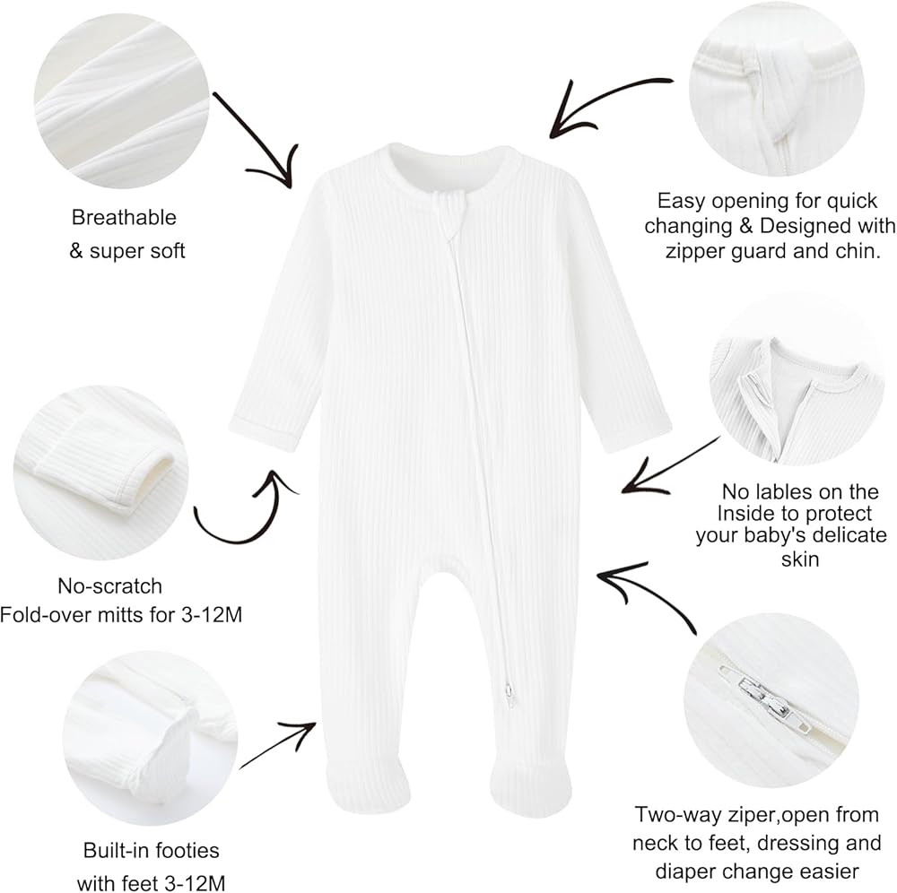 Double Zippers Sleepers: 12 months baby footie pajamas open from neck to feet, two-way zipper at both ends, makes this onesies easy to put on and take off, perfect for changing baby's diapers. Safety neck tab protect baby's delicate skin
