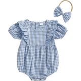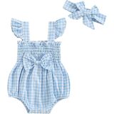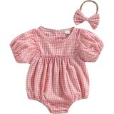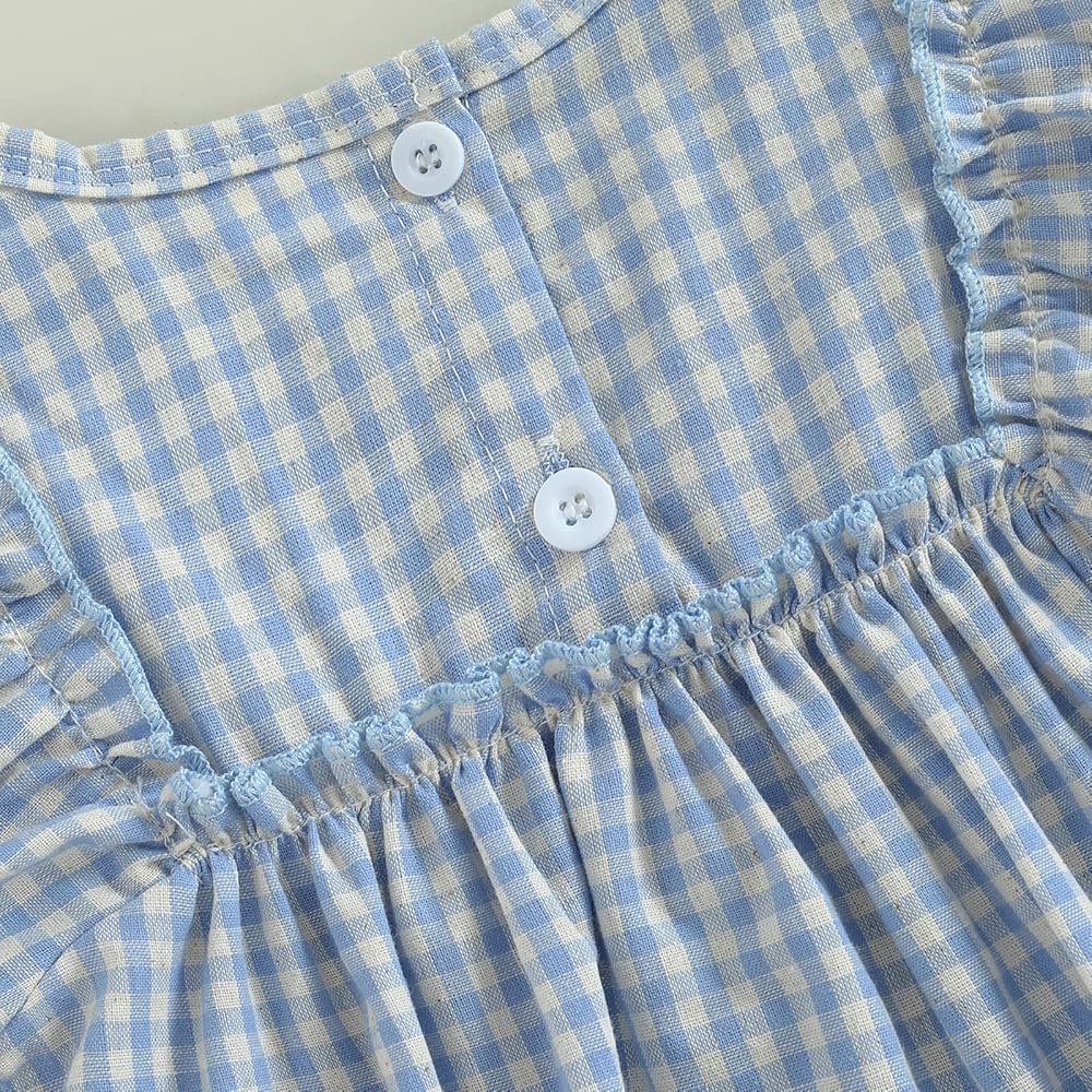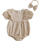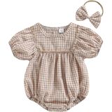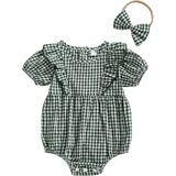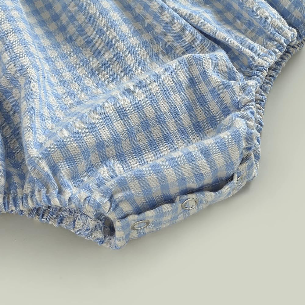 Feature: Baby romper girl, short puff sleeve, plaid pattern, ruffled butt design, back button closure, snap at the crotch, bubble romper baby girl, newborn girl clothes, boho baby girl clothes, make baby girl look more cute