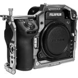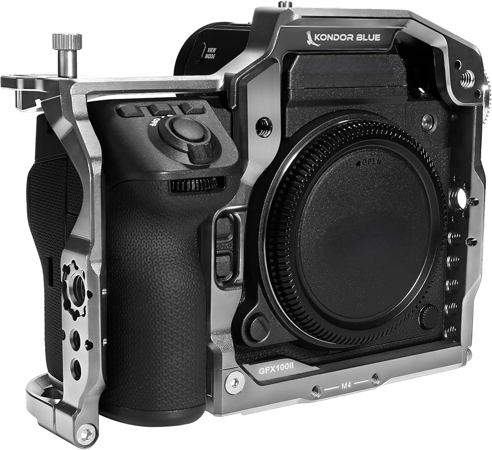 When designing the cage, we knew we needed to create something truly special. Our design philosophy was anchored on speed between setups, strength suited for the biggest sets, and an overall sleekness that the camera's design demands. Those pillars led to the development of KONDOR BLUE's brand new Hatch System—a completely unique way to mount your camera cage with as few bolts as possible all while remaining rock solid. The Mid-Rail and eyelet inserts are core to the system's strength and rigidity. The Bottom Plate becomes a “hatch” which pivots and clasps around the base of the camera. Now only 4 bolts are necessary to assemble the cage offering the best strength-to-weight ratio of any cage on the market. The GFX 100 II cage comes fully prepped to install out of the box. Users mount the cage by swinging the pivoting Bottom Plate 180°, then setting the cage on top of the camera while sliding in the eyelet connectors, and swinging the Bottom Plate back into place. The Hatch system has also allowed us to design the cage to be even more form-fitting and dramatically speeds up installation and cage removal times. Best of all, all bolts necessary to remove the cage are clearly marked with arrow engravings. Beyond the new assembly style, the GFX100 II cage includes all of the pro features you've come to expect from KONDOR BLUE: NATO rail on Side and Top Plates, stainless steel ARRI style rosette, ARRI style anti-twist mounts (¼ 20 and ⅜ 16), removable HDMI/USB-C yoke, built-in tools for assembly, angled cold shoe with safety stop, and our signature bubble level.