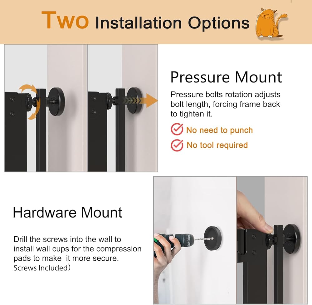 Two Installation Options: Pressure install without drilling wall for a quick setup, the soft rubber feet ensure your walls or door ways are left damage free, or hardware mounted(hardware included) to make the tall cat gate more secure.