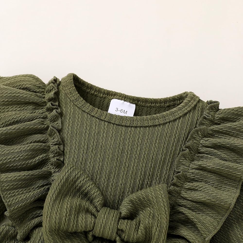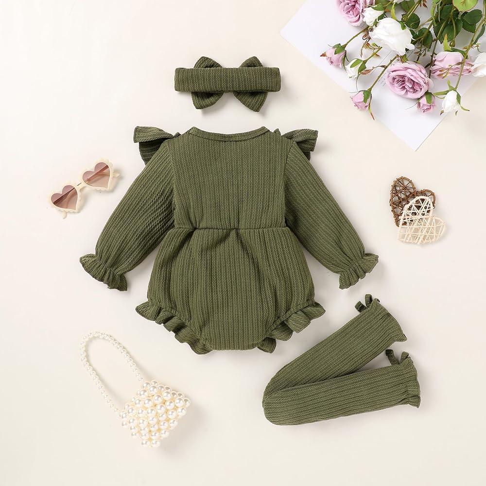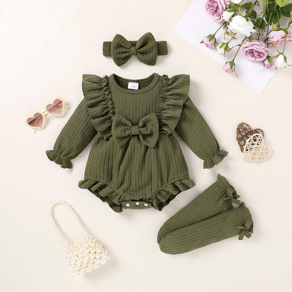 Design:There are two types of rompers available for you to choose from:floral print and solid color,pink and green flower print jumpsuits are lively,simple and pretty solid bodysuits suitable for fall winter wear,baby girl fall outfits with ruffles,large bows,matching socks with cute bows,baby girls rompers headband/hat socks 3Pcs sets perfect for birthday gift,baptism gifts and birthday photoshoot souvenir