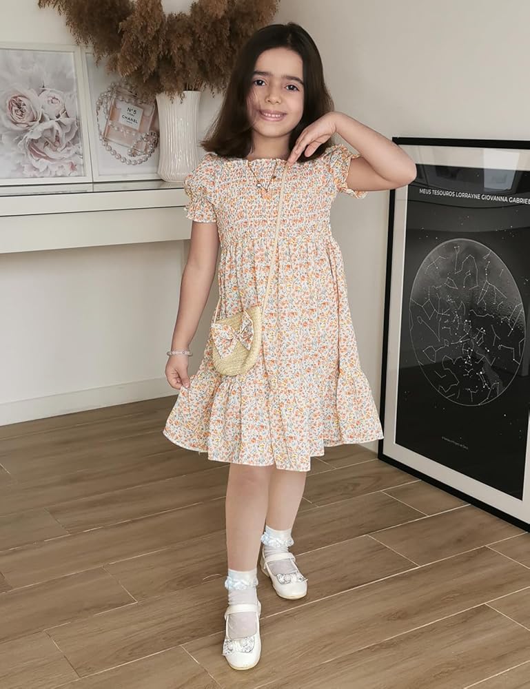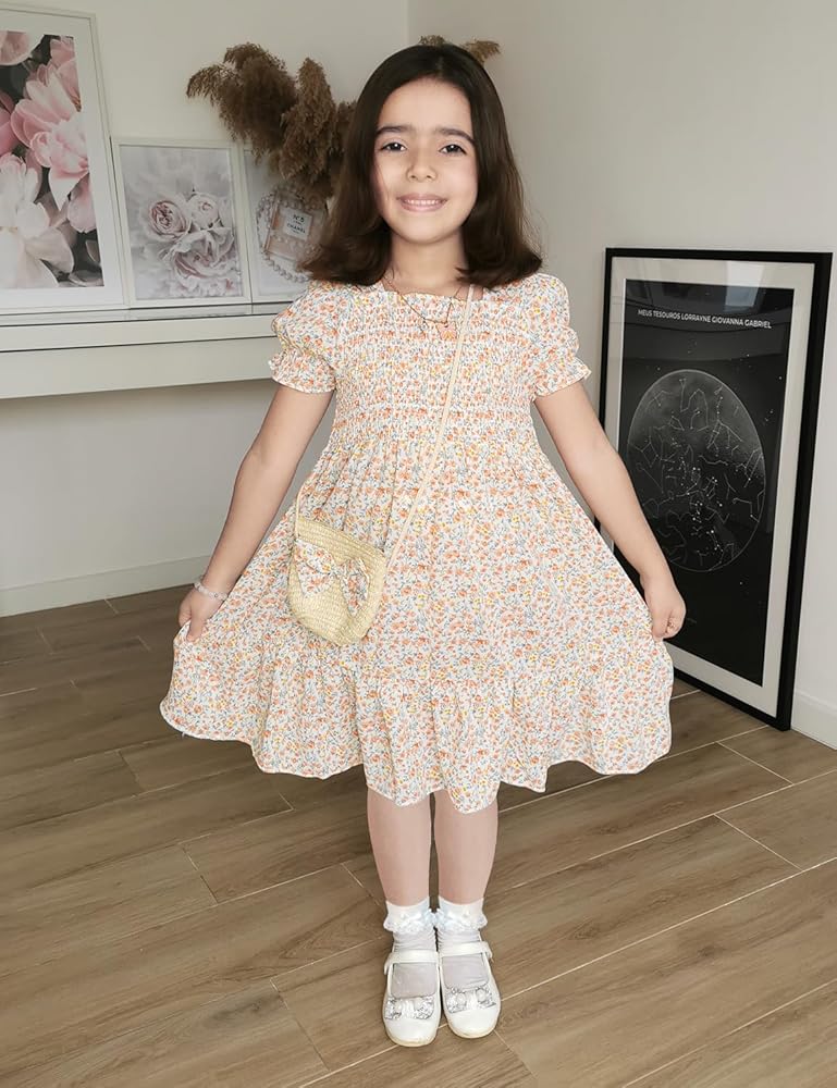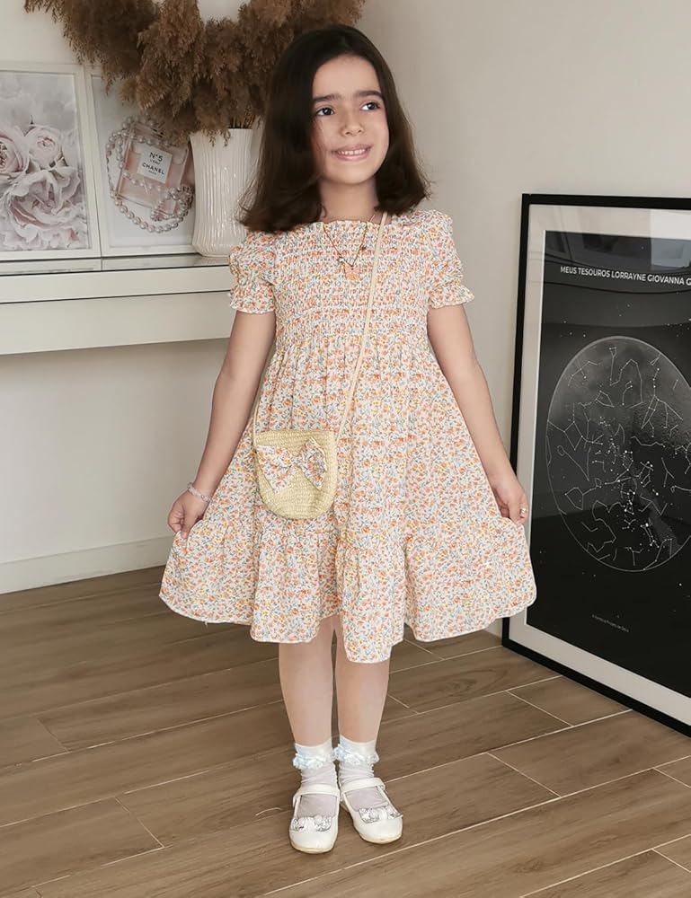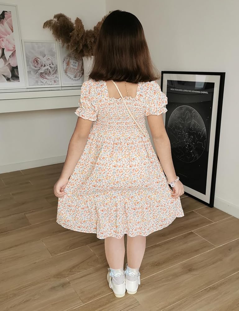 Style: AGQT girls floral dress, fashionable elastic square neck design with special floral print, A line dress with cute elastic puff short sleeve, beautiful toddler summer dress with ruched bust and flowy hem. The bowknot bag add a pretty detail on this dress. Which make your girls more cute and shine.