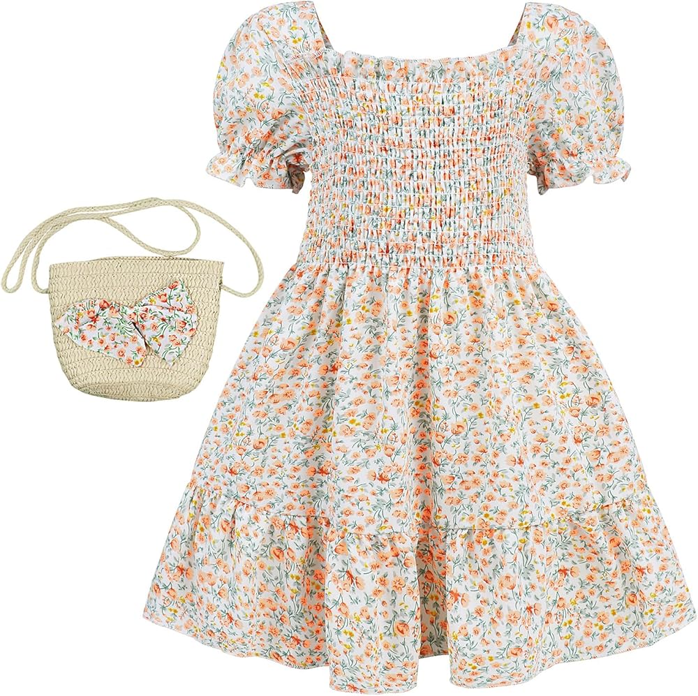 Size: Little girls square neck floral summer dress with bag fit for 18-24 months baby girls summer dress, 2-3t toddler girl dresses, toddler dresses 3-4t, summer dresses for girls 4-5t, girls dresses size 6-7t.