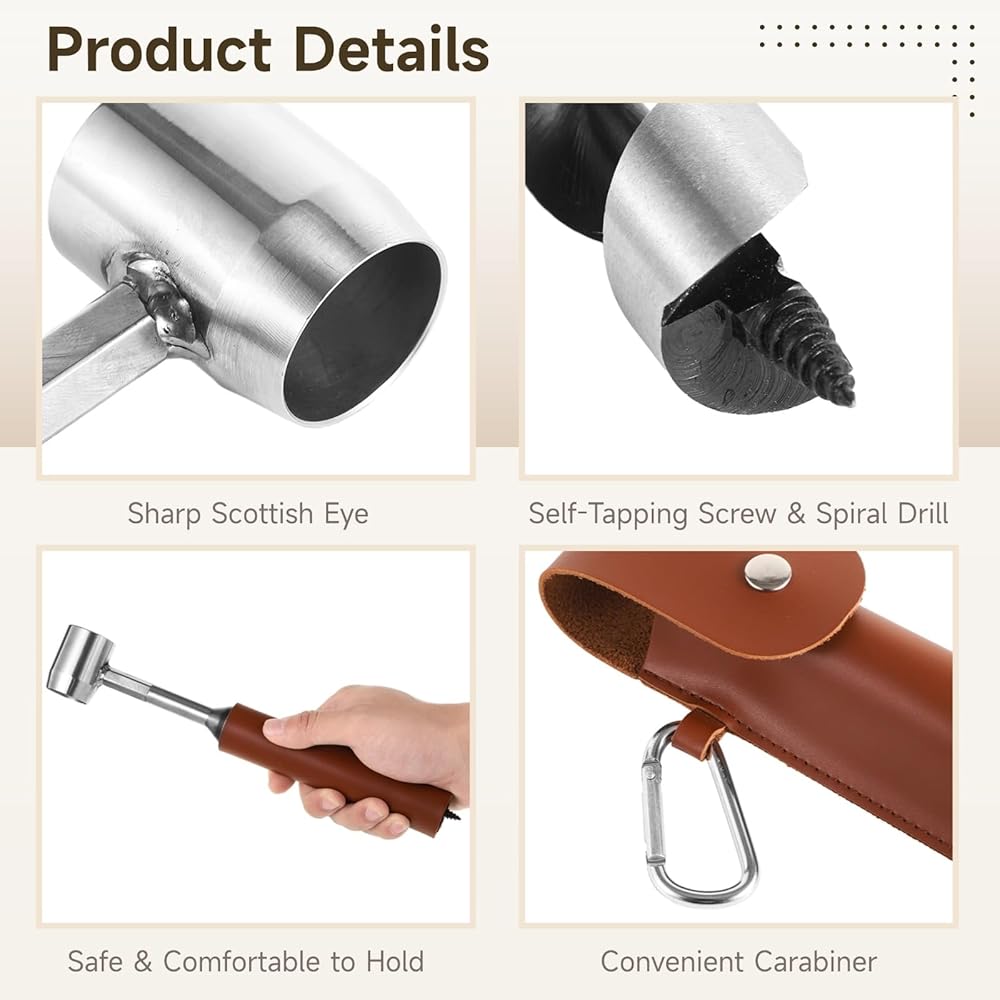 User-Friendly Design: The scotch eye design allows for enhanced leverage using natural materials like branches, while the spiral drill with self-tapping screw tip for precise hole-making in various wood types