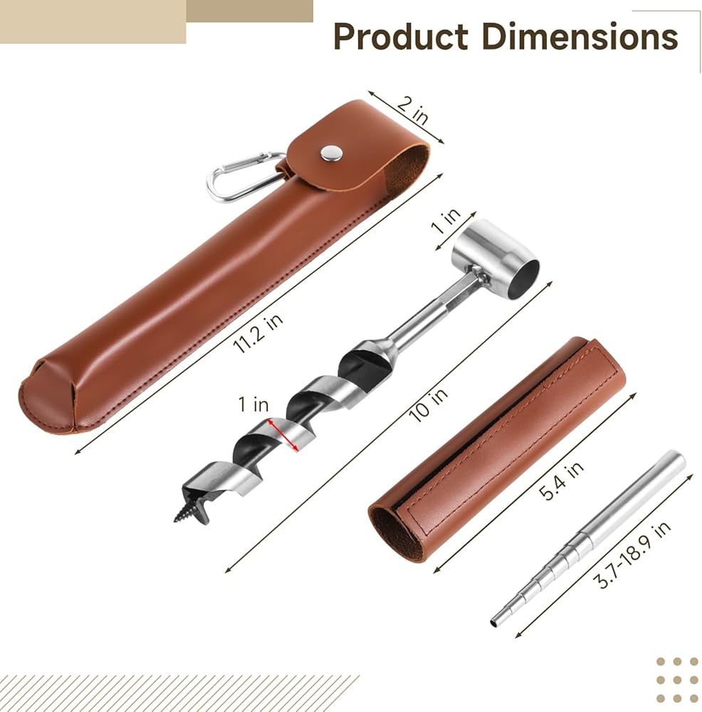 Professional Drilling Set: This kit includes a 1 x 10 inches spiral auger with scotch eye design, a leather handle cover, an extendable hollowed pole that adjusts from 3.7 to 18.9 inches, and a leather carrying pouch for convenient storage and transport