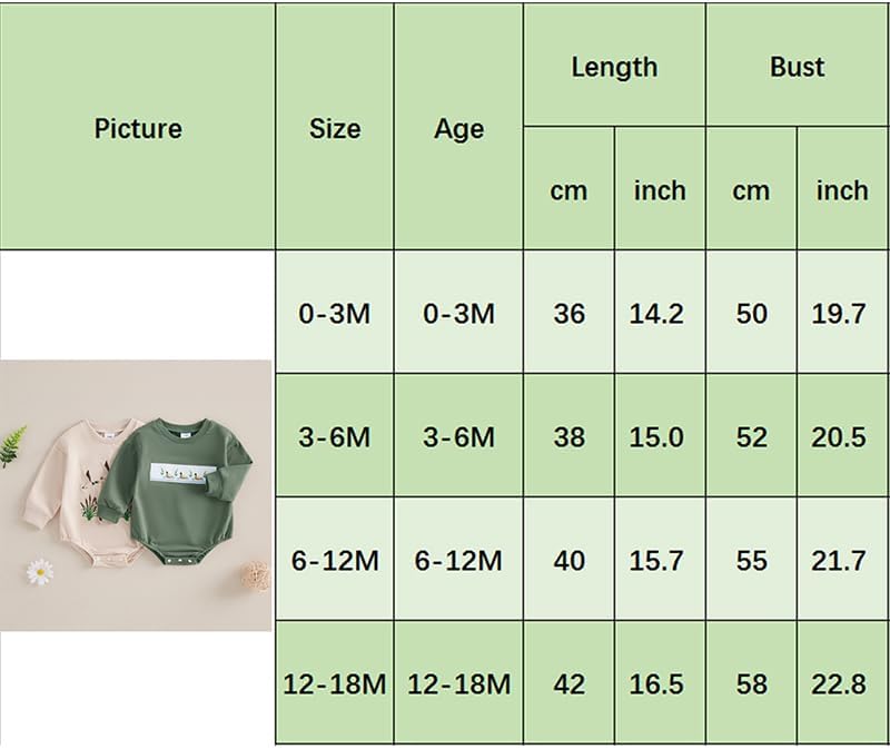 3-6M Length: 14.96 Bust: 20.47 Suggest Age: 3-6 Months