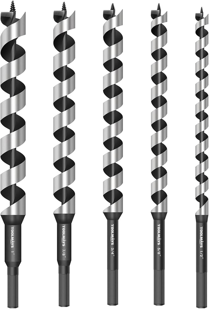 [PRODUCT SIZE]: 5-piece auger drill set, length 12 inches, with 3/8-inch hexagonal handle. It can drill a hole 10 inches deep. The spiral tip helps to start more safely and smoothly. 1/2'' 5/8'' 3/4'' 7/8'' 1''