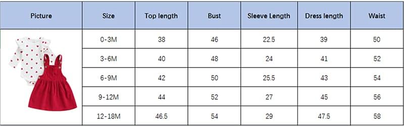0-3 Months Romper Length: 14.96 Bust: 18.11 Skirt Length: 15.35 Waist: 19.69