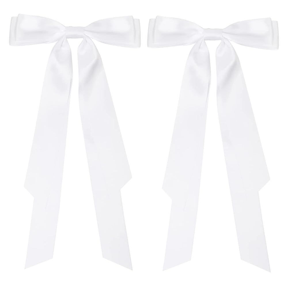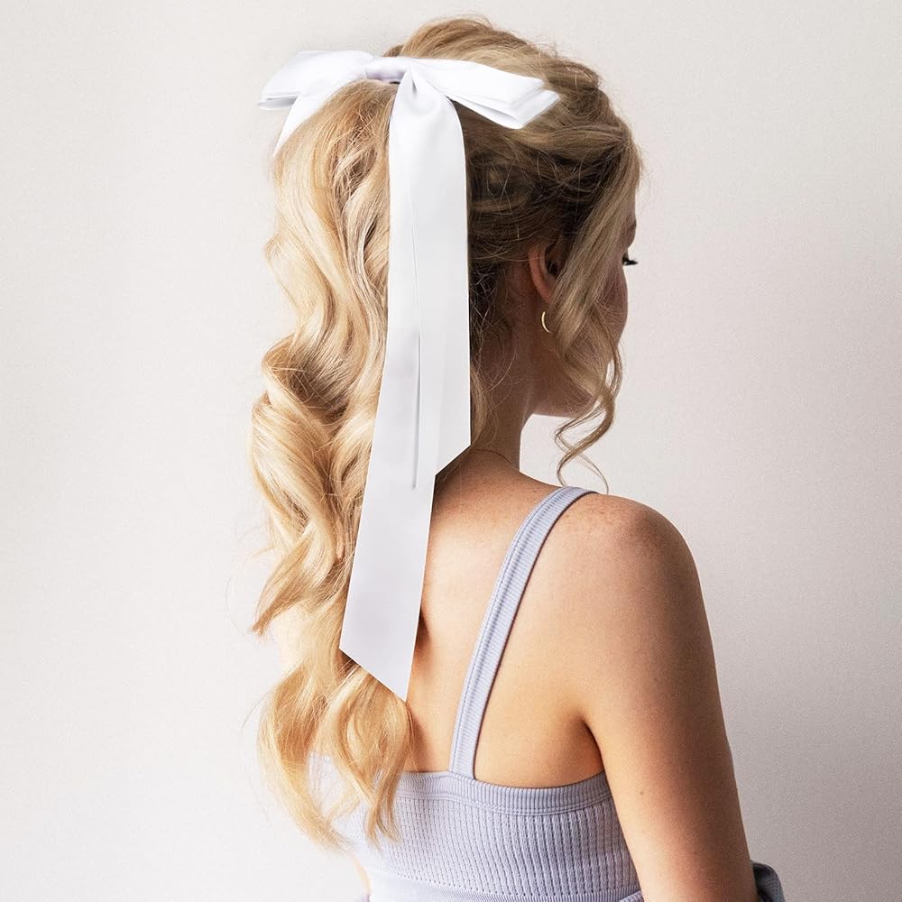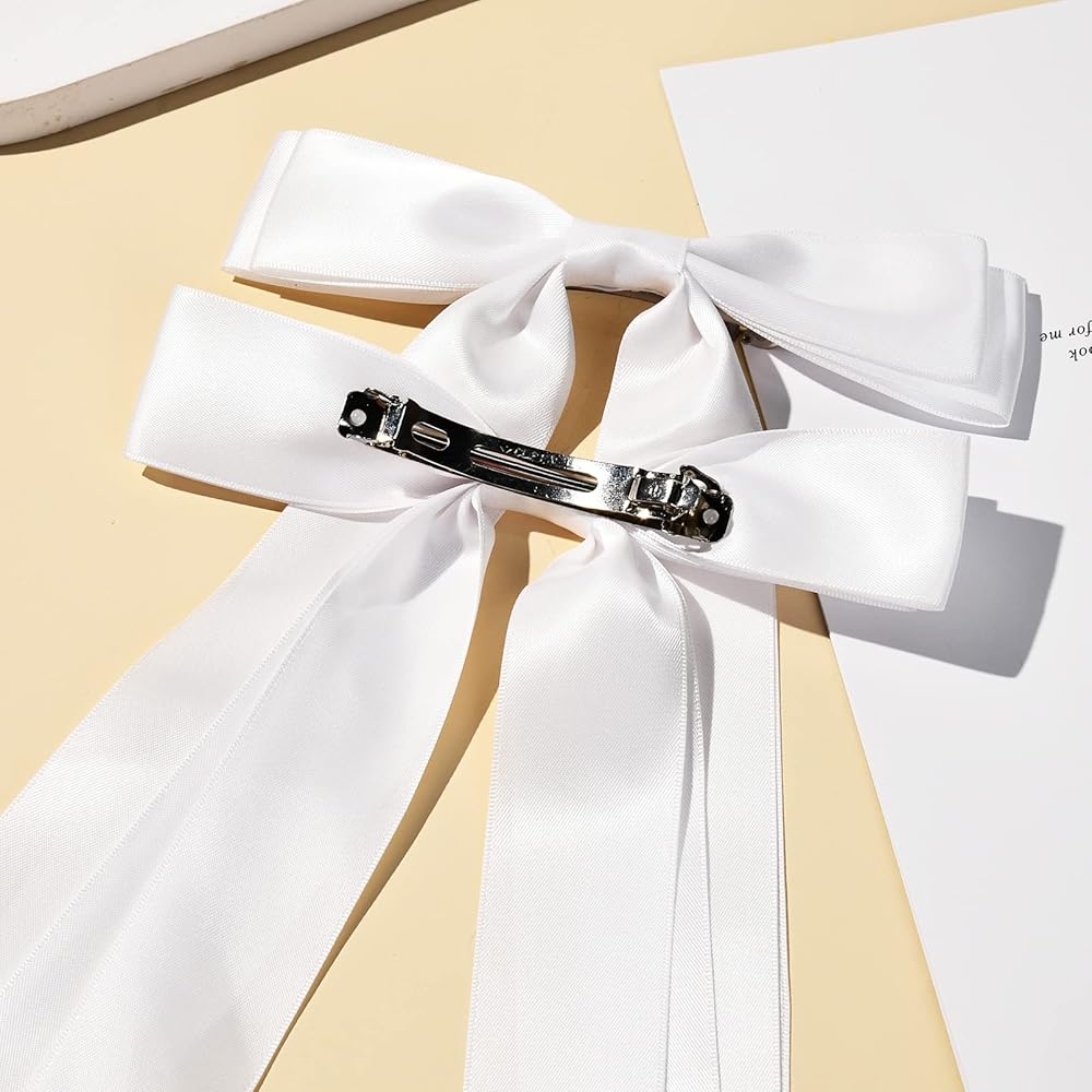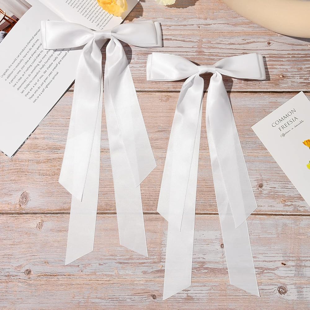 it adds a touch of class and refinement to the overall outfit This long flowing satin ribbon bow with a metal spring clip is a stylish and versatile accessory for women. With its beautiful material, size, and color options, it is a perfect choice for weddings, proms, or any special occasion where a touch of elegance is required