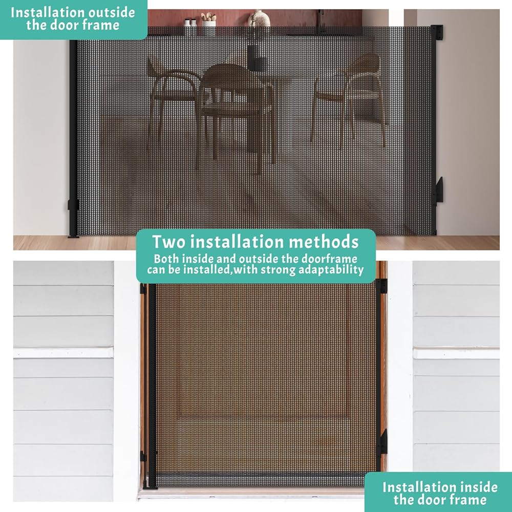 Quick and Easy Installation: The retractable baby gate has an adjustable lower bracket that easily fits various baseboard heights, allowing for simple installation without damaging the baseboard. You will receive: retractable baby gate x1, Wall guides x2, Bracket x2, Latches x2, Wall anchors x8, Screws x8, Instructions x1. With the included tools, you can have a secure baby gate up in just a few minutes.