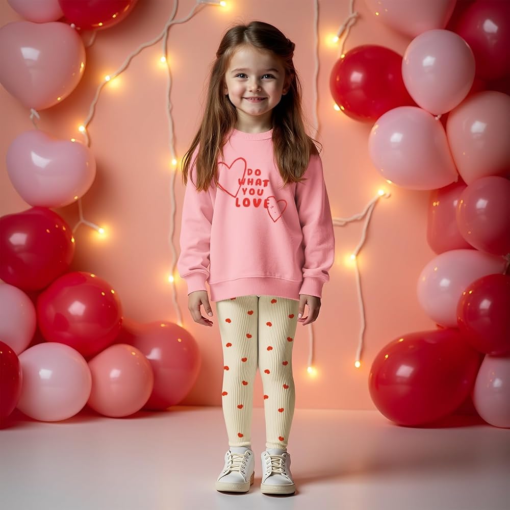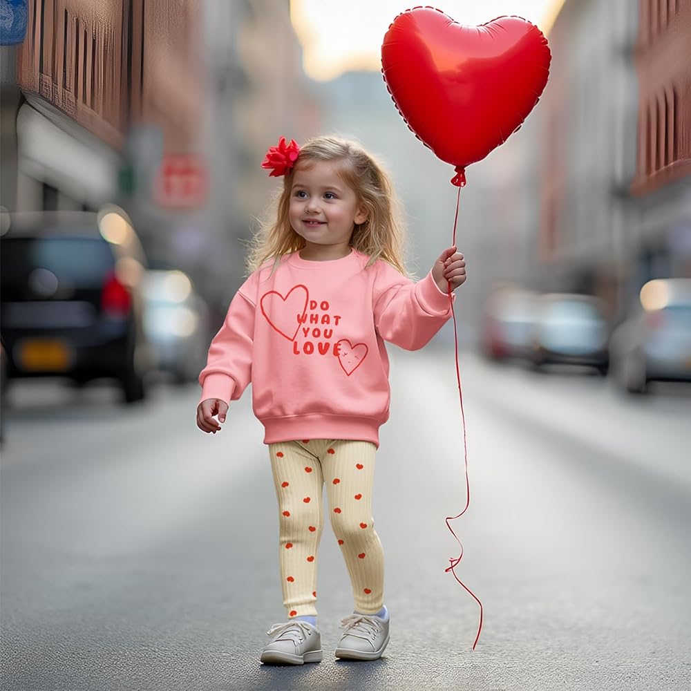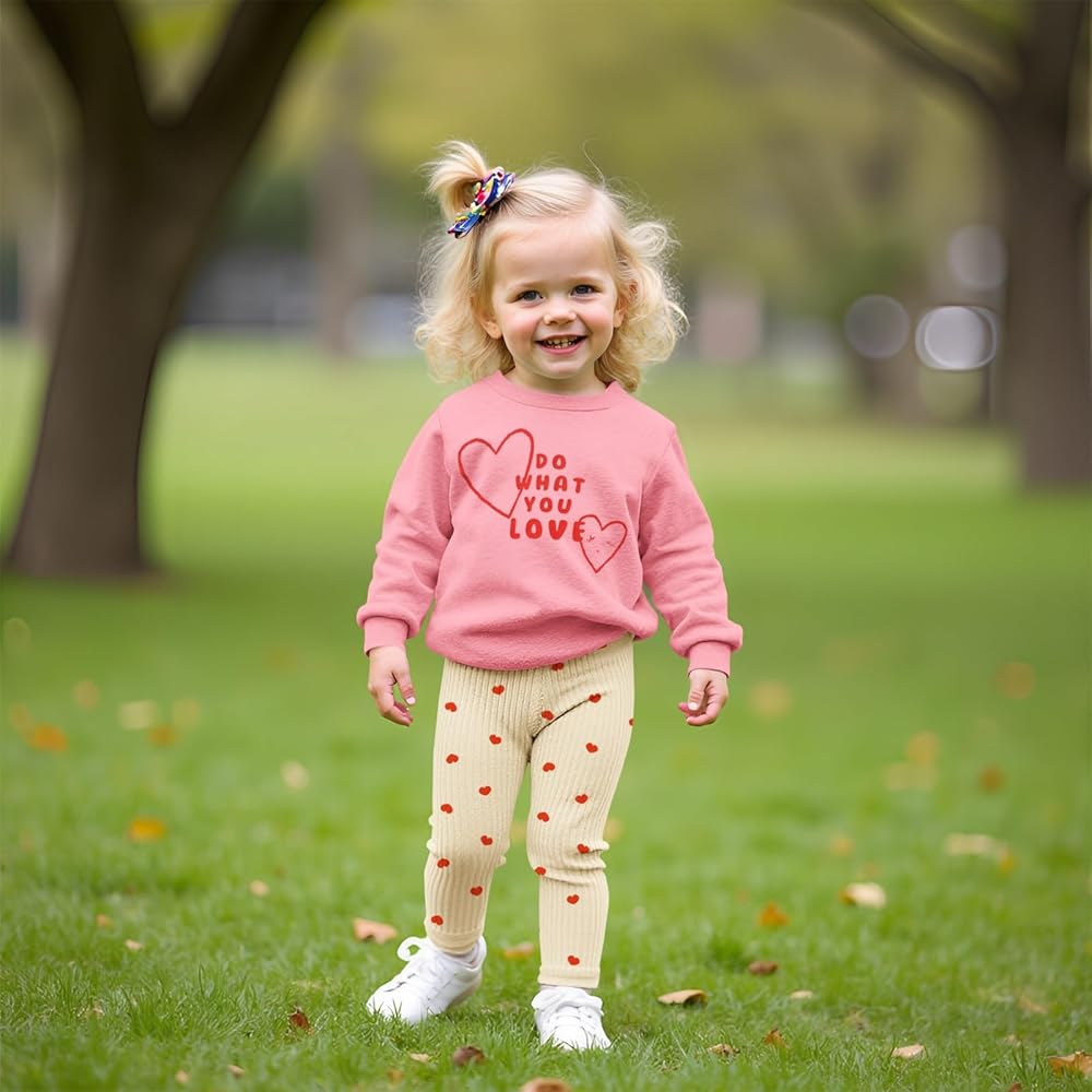 💕Design: Valentines toddler girl clothes. Cute do what you love letter printed, round neck, long sleeve, matching with heart print ribbed legging. Toddler baby girl valentine love heart outfit set, adorable and playful. Make your princess more charming and stand out on Valentine's Day.