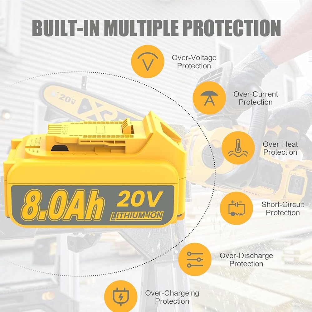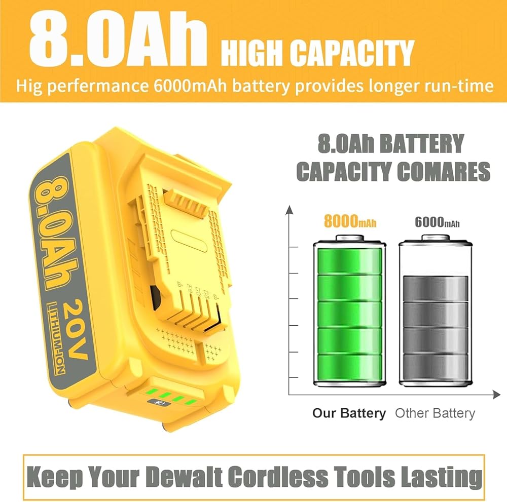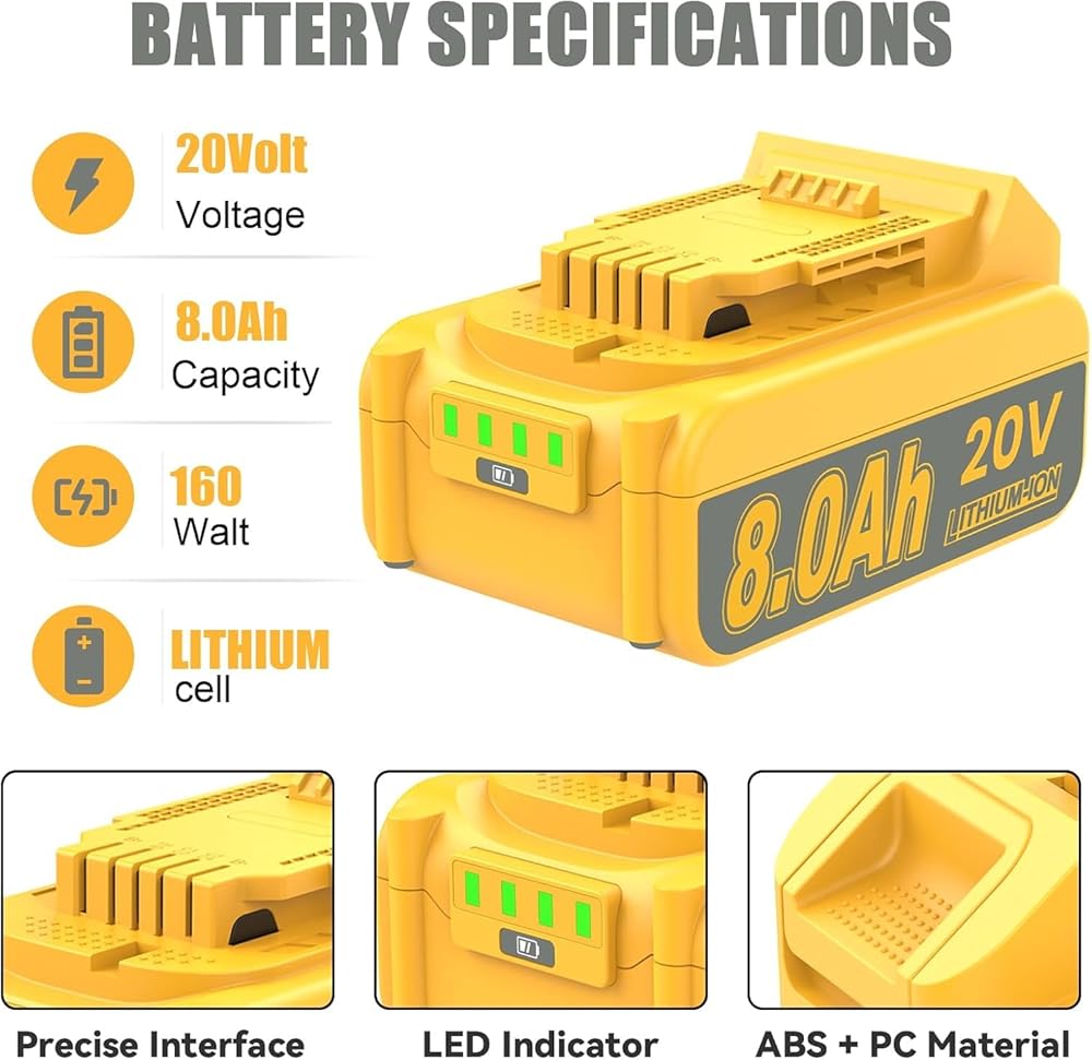 🔋【Battery Features 】Battery Voltage: 20V | Battery Capacity: 8000mAh | Wattage: 160Wh | Battery Type: Rechargeable Lithium-ion | Made with high quality Li-ion cells. Compatible with dewalt 20V cordless tools.