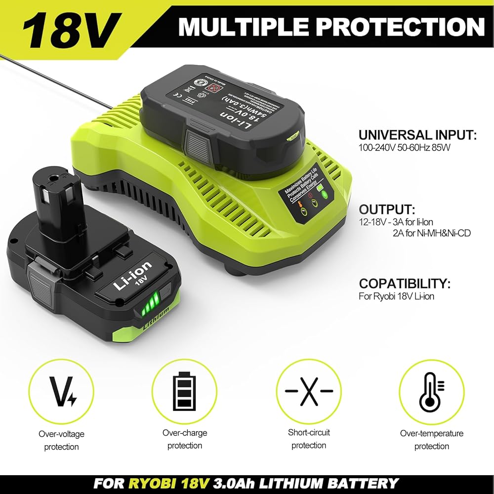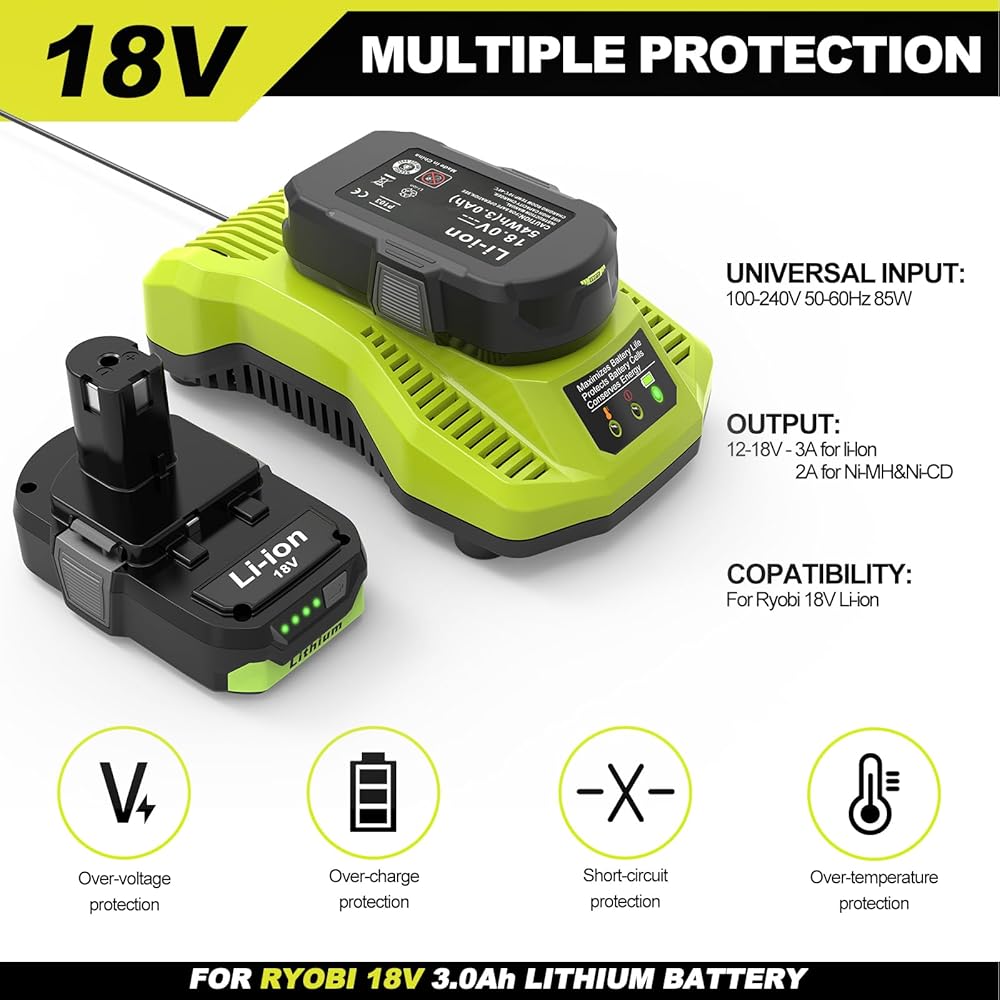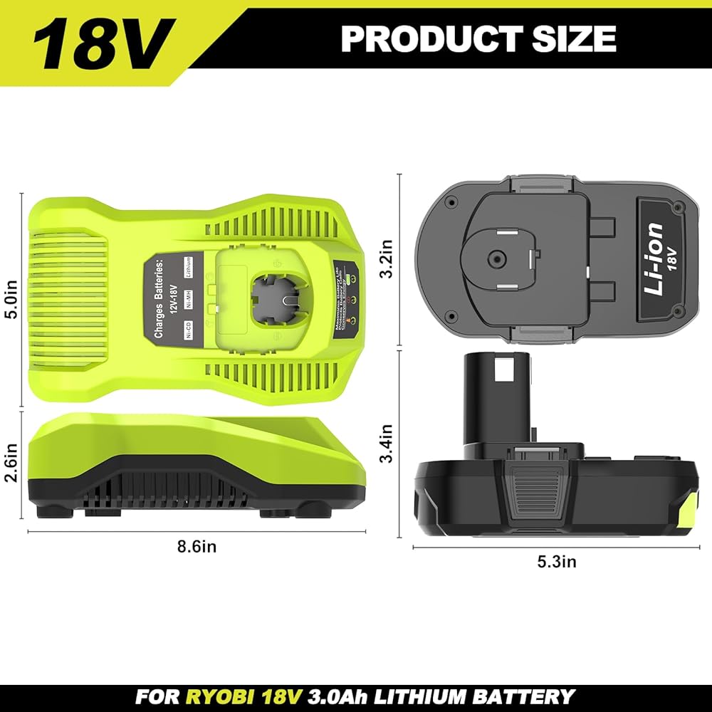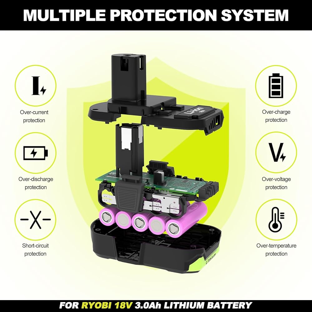 Specification: 18-volt 3000mAh Lithium ion Batteries; Replacement for Ryobi 18v High Capacity Output Battery, with LED Indicator to Monitor Remaining Power