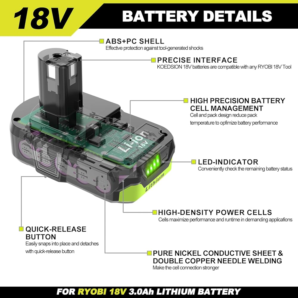 Safety & Stability: Koedsion 18-volt Battery Using the Batteries Management System to Avoid over-Charge,over-Discharge,over-Current,over-Voltage, Short Circuit and over-Temperature, will not Cause Damage to the Power Tool and Charger. Replace for Ryobi one+ 18v Batteries no Memory effect