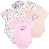 MAMA'S BESTIE, DADDY'S GIRL 6 PIECE BODYSUIT SET: Contains (6) short sleeve, snap closure bottom bodysuits for easy on and off access for diaper changes including (1) “Mama's Bestie” scripted, (1) “Daddy's Girl”, (2) Floral printed, (1) Striped and (1) Polka Dota suit for a full, fun collection of looks.
