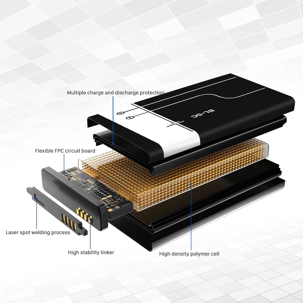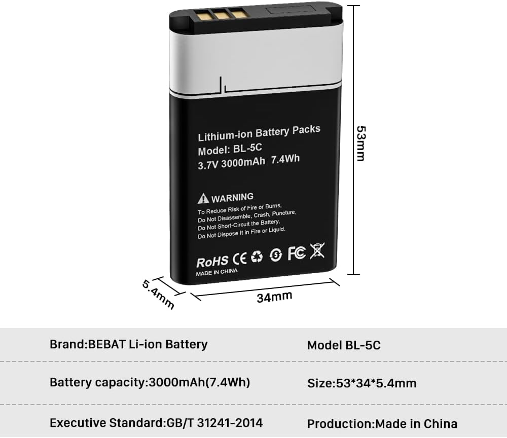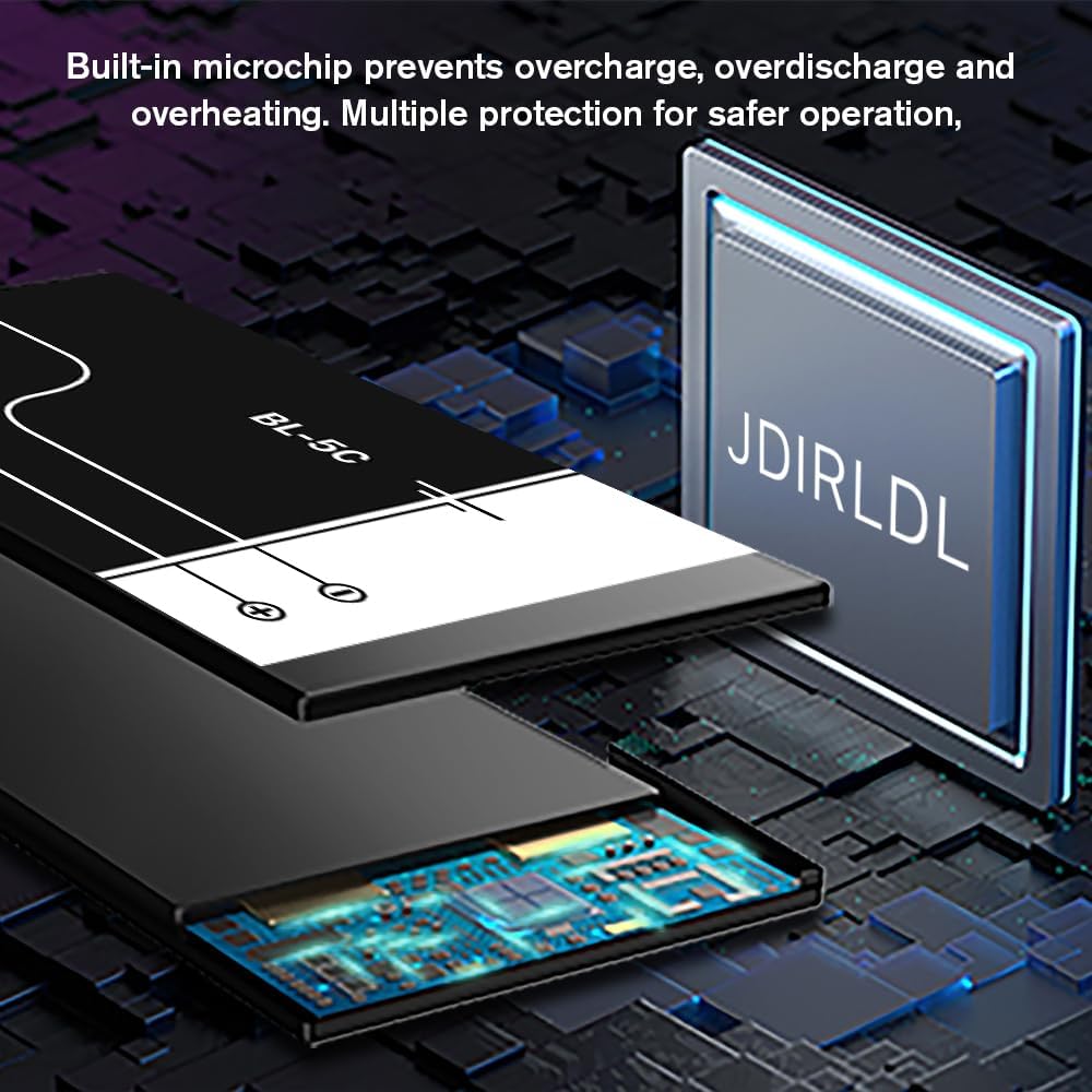【 Premium Grade A+ Cell lasts 】 : High quality grade A+ battery cells ensure longer battery life (900+ cycles) , This BL-5C Replacement Battery uses Grade A+ rated battery cells with CE and ROHS, UL and UKCA certification, Internal chips prevent the battery from overheating, circuiting, overcharging, discharging and short-circuiting. ensure last over 1000 charge cycles.
