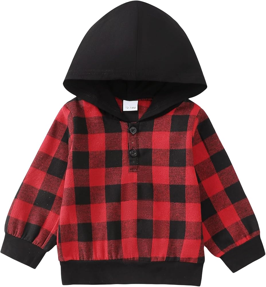 Toddler boy clothes include long sleeve plaid hoodie shirt with cute pocket,matching elastic ripped jeans pants are stylish and bring convenience for movement.A variety of styles and colors to provide you with more choices,orange plaid,red plaid,green plaid,green and black plaid,brown plaid,black style.
