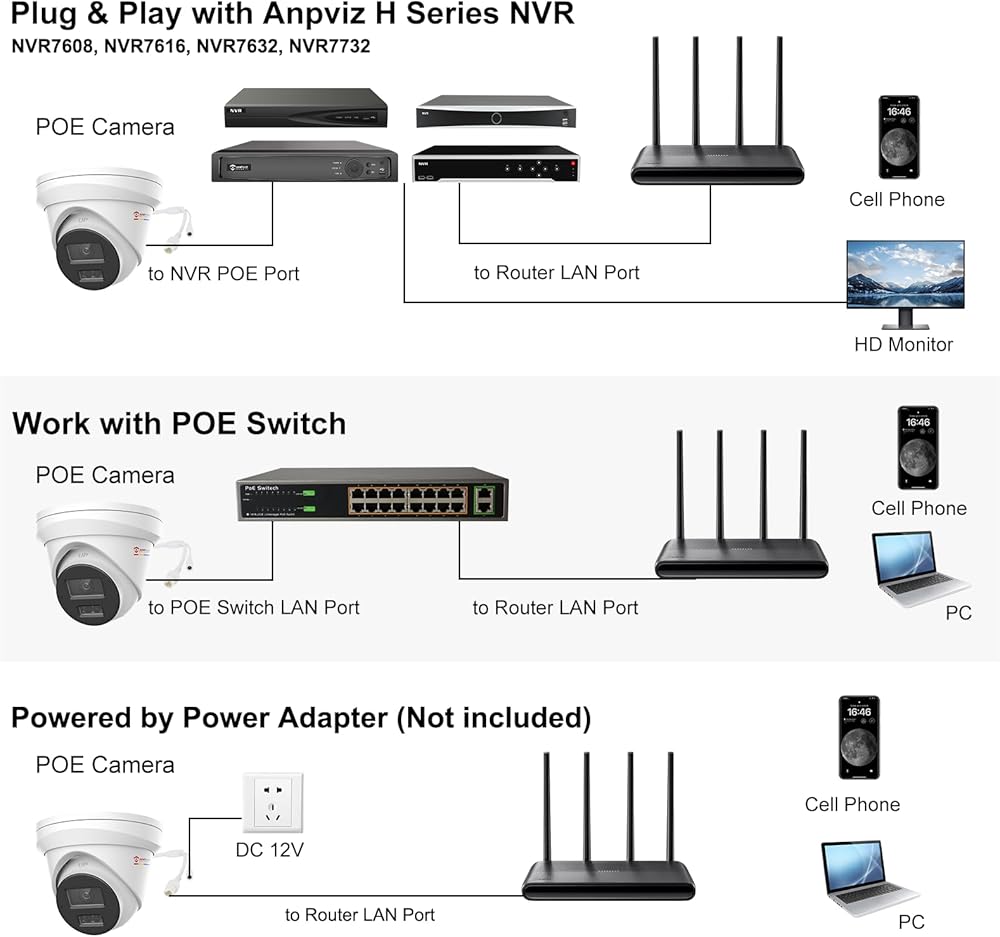 Multiple Working Solutions: Plug & Play with all Anpviz H Serie NVRs (8CH, 16CH, 32CH, 64CH) for optimal performance. Enjoy seamless compatibility with 3rd-party on-vif NVRs and software, such as ISpy, Blue-Iris, Syno-logy and Mile-stone. Phone App: Guarding Vision, PC Client: iVMS. It's also viewable on web browsers like Edge, Chrome, and Firefox.