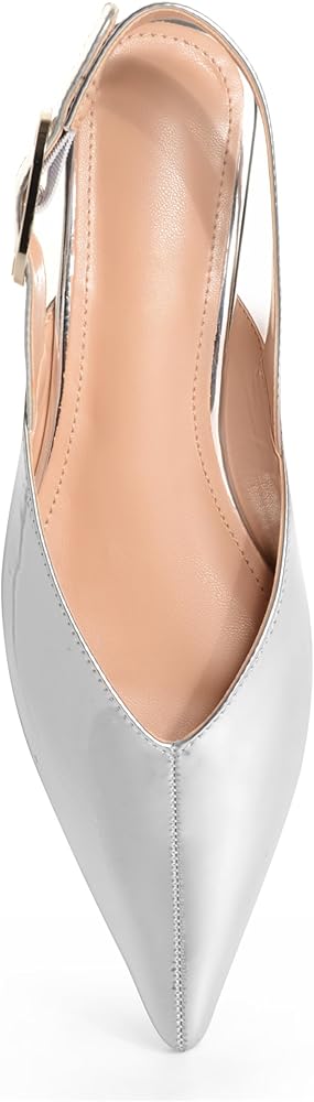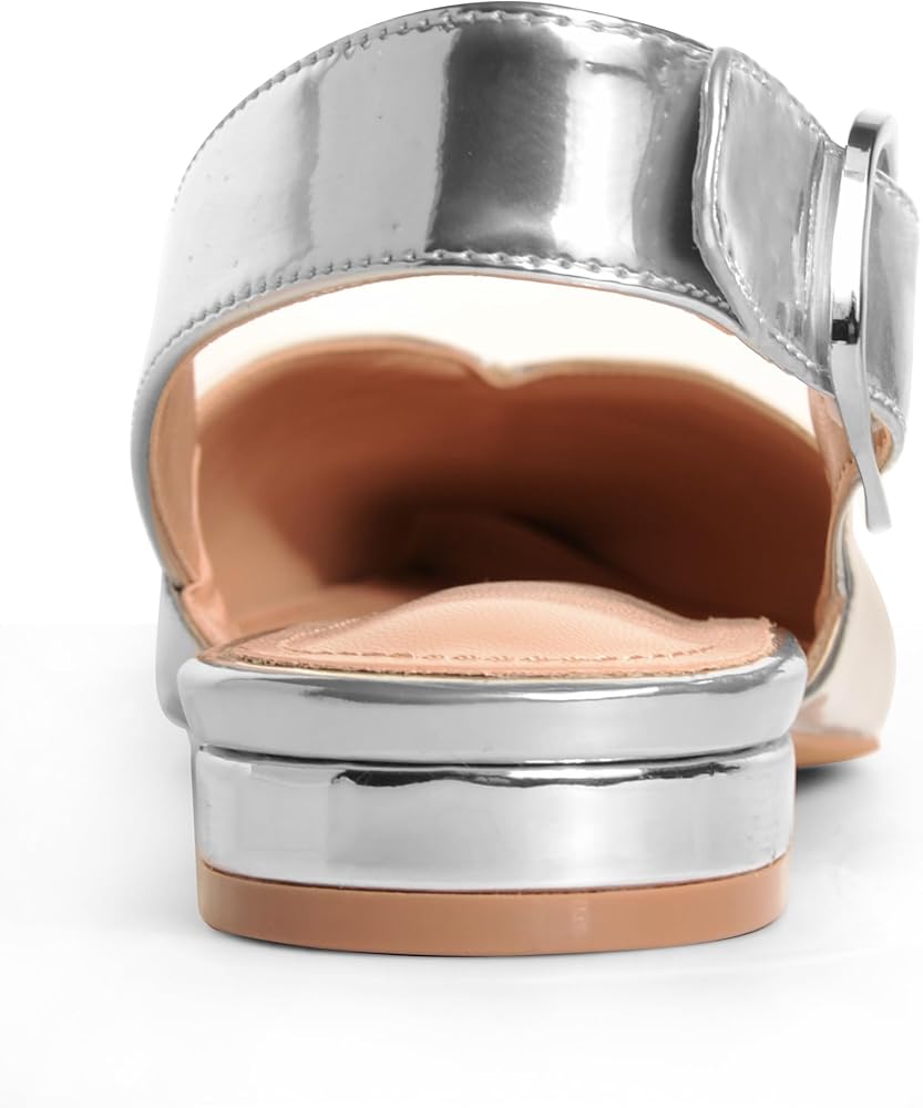 - Elasticized slingback strap; adjustable strap with buckle closure