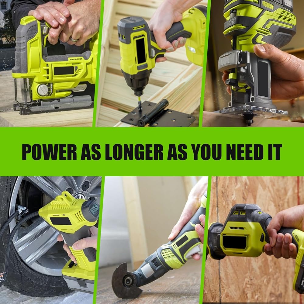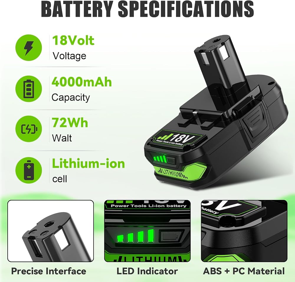 🔋【Battery Features 】Battery Voltage: 18V | Battery Capacity: 4000mAh | Wattage: 72Wh | Battery Type: Rechargeable Lithium-ion | Made with high quality Li-ion cells. Compatible with ryobi 18V cordless tools.